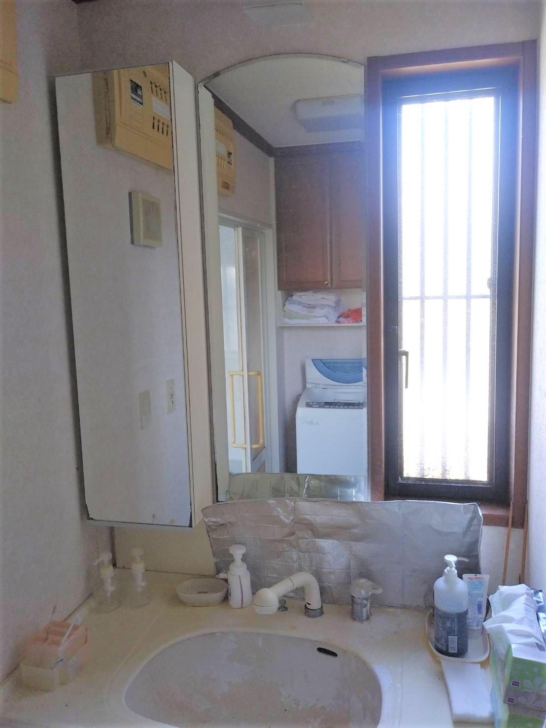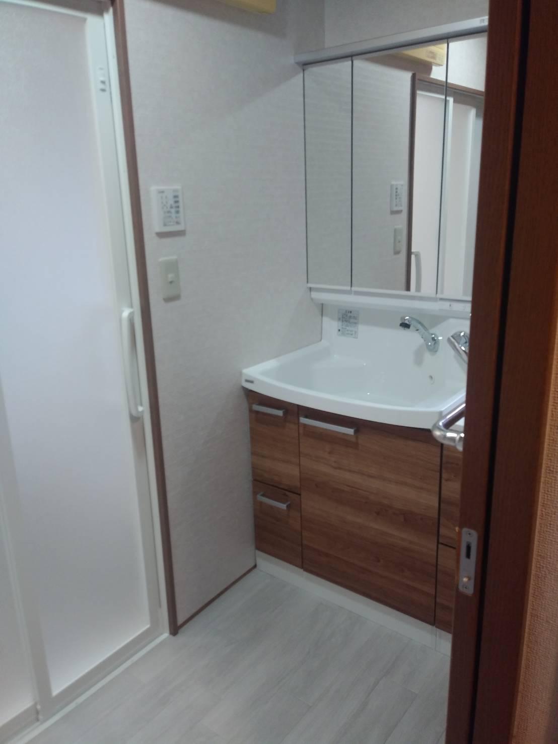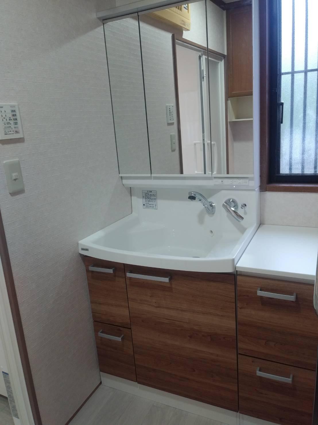 既存の洗面台を撤去し木目調の洗面台に入れ替えました。 脱衣室が見違えるほど明るく清潔感のある仕上がりになりました。