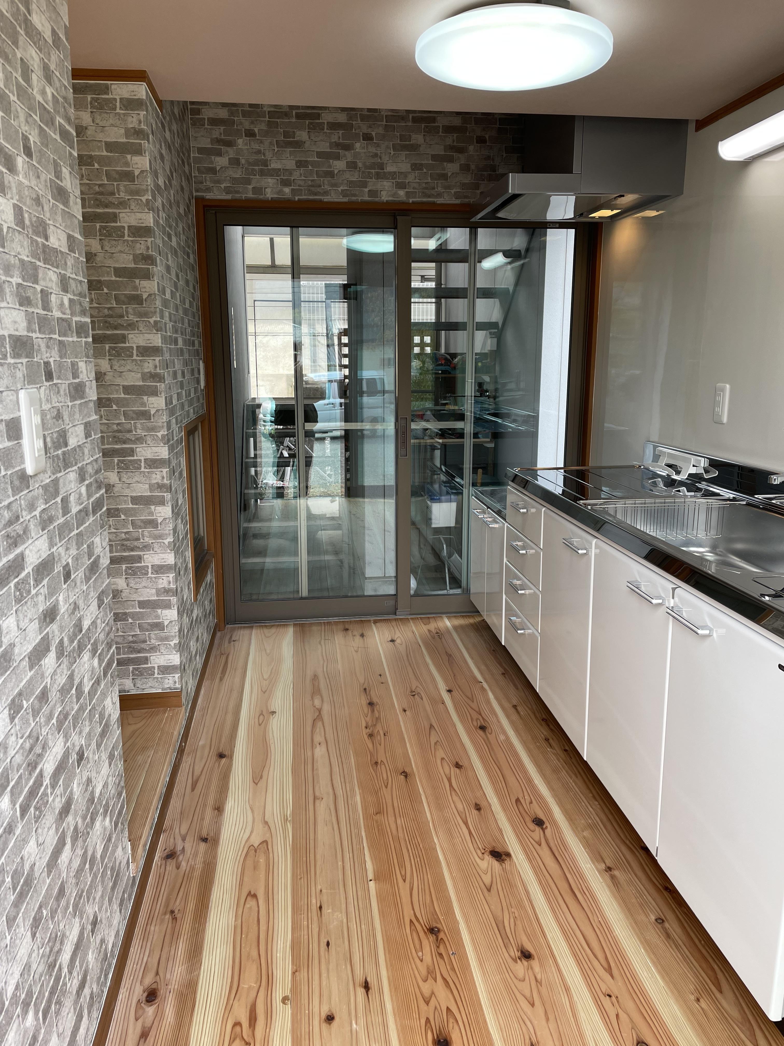 空いた空間に、キッチンを改築いたしました。 奥様のお仕事(お菓子作り)の作業スペースを空いた空間に設けキッチン・手洗場を設置いたしました。 レンガ調の壁紙と杉材の床がピッタリマッチしたハイセンスなとってもおしゃれなキッチンが完成しました。