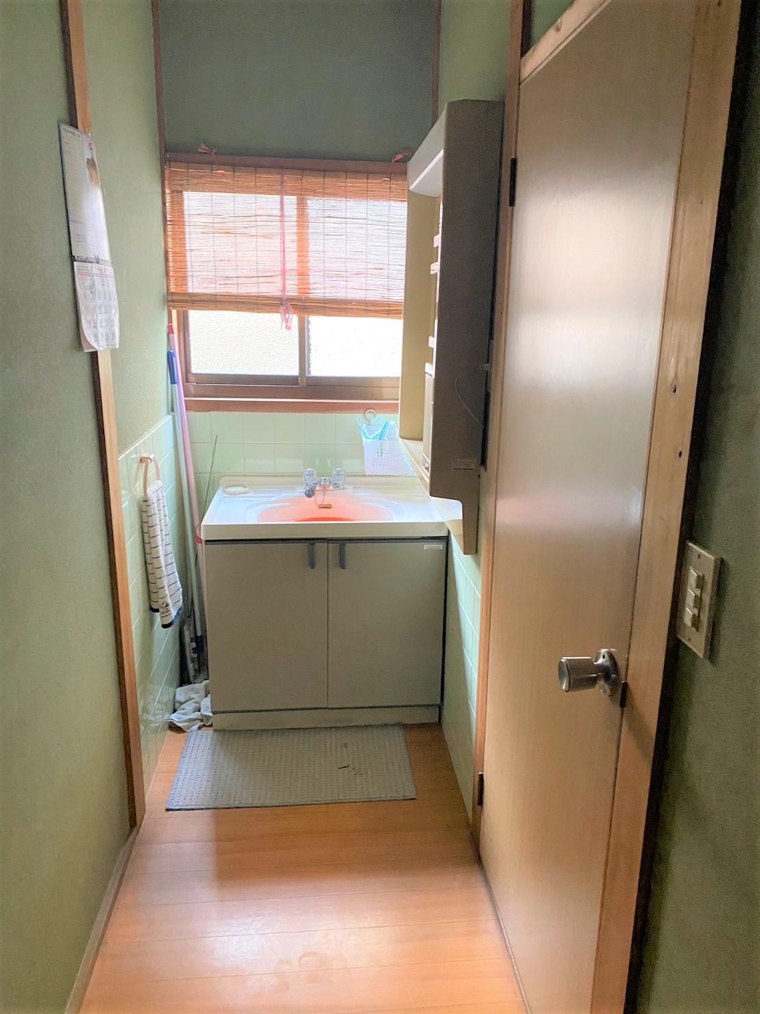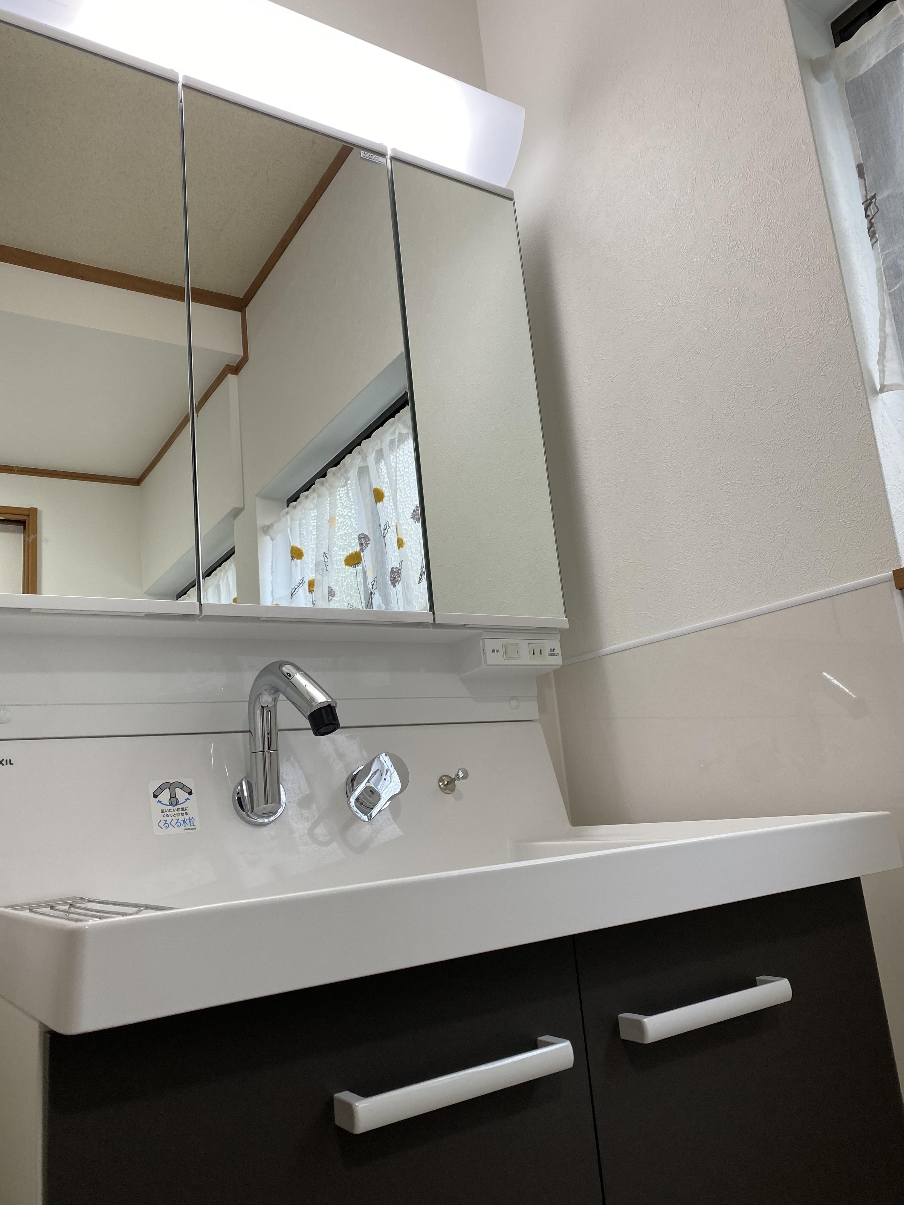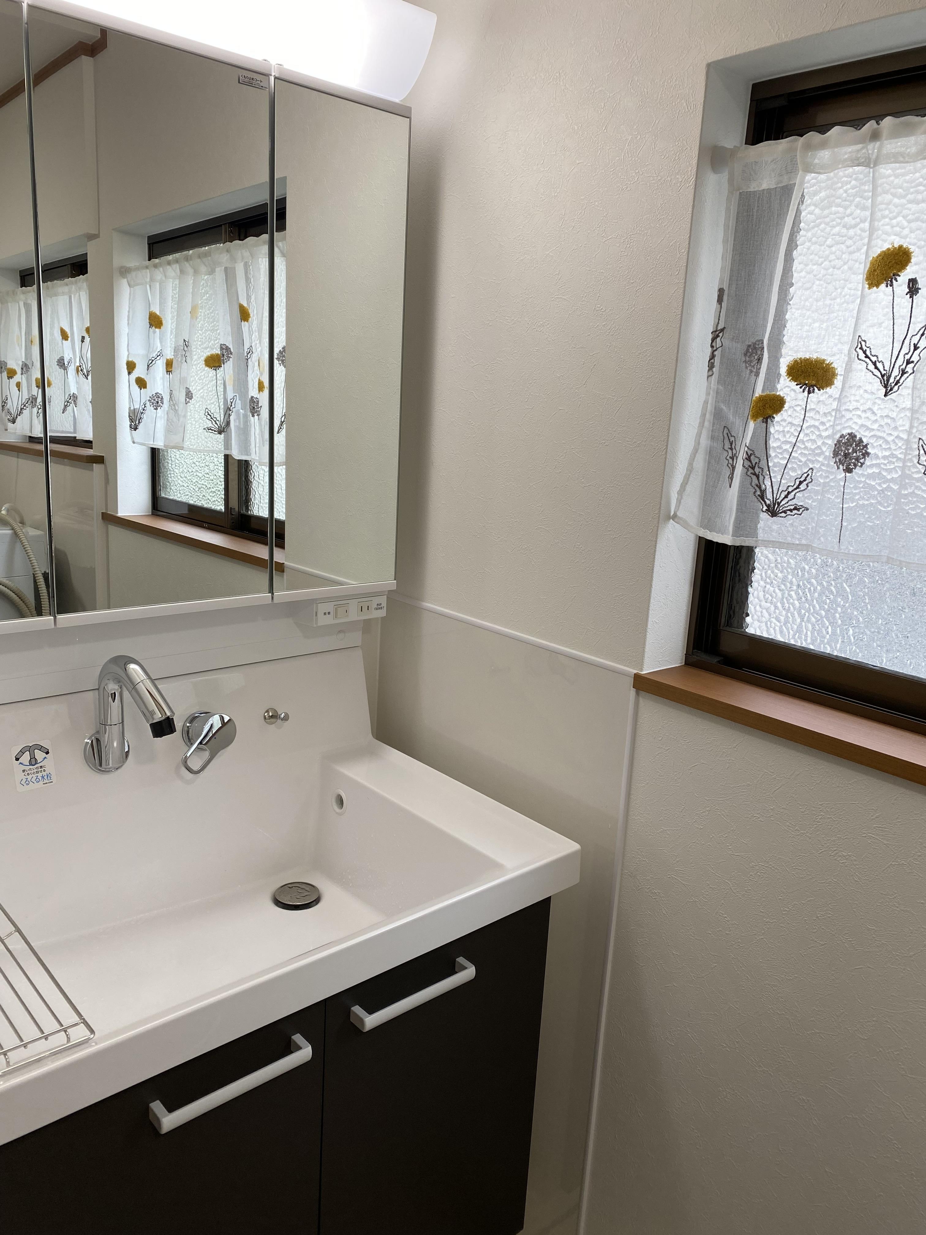 洗面化粧台の取替工事 元あった場所は明り取りの窓をふさいでしまうので隣の壁を抜き、新しい場所に設置しました。 窓を残すことで、室内も明るく風通しの良い空間になりました。