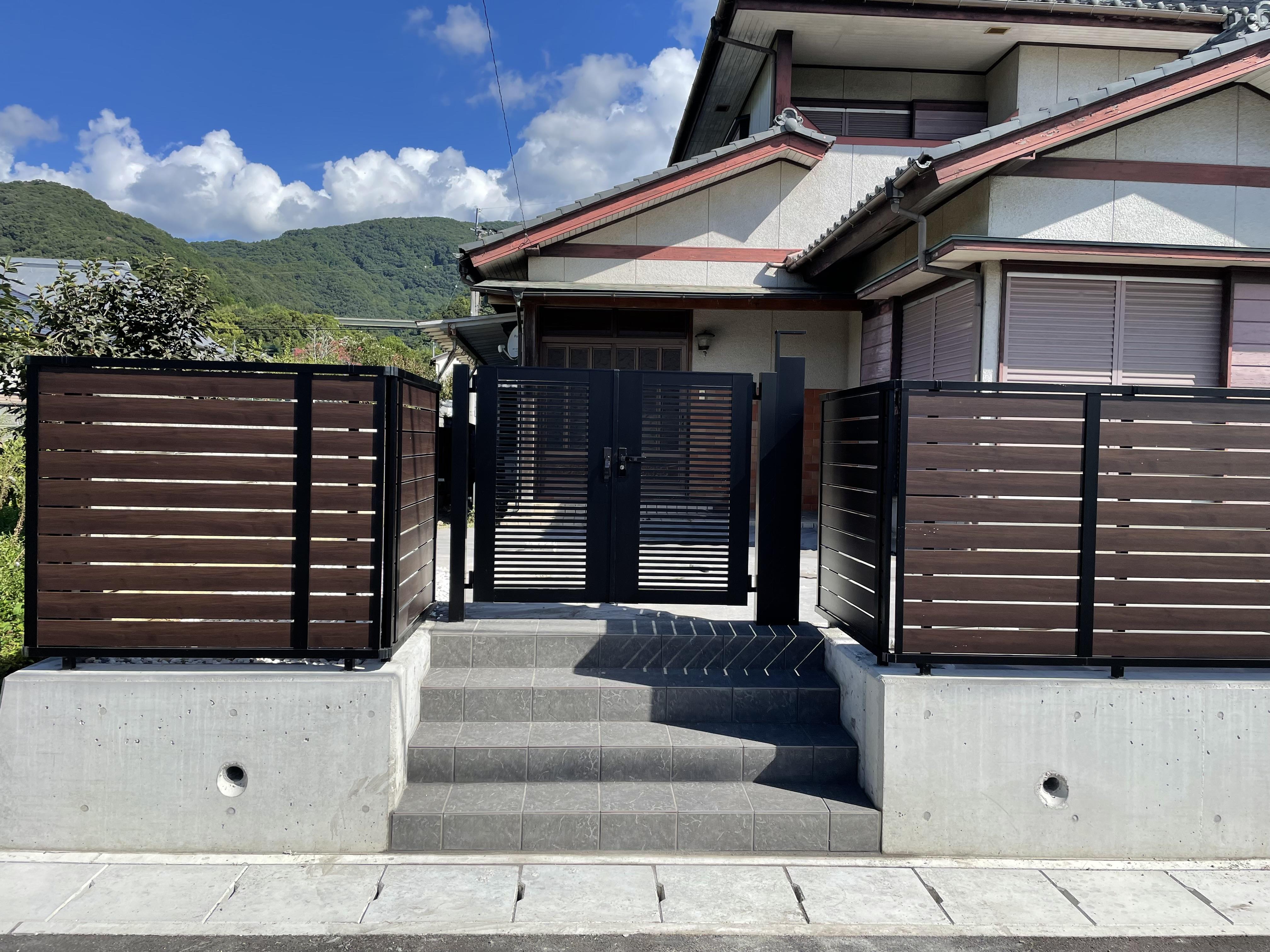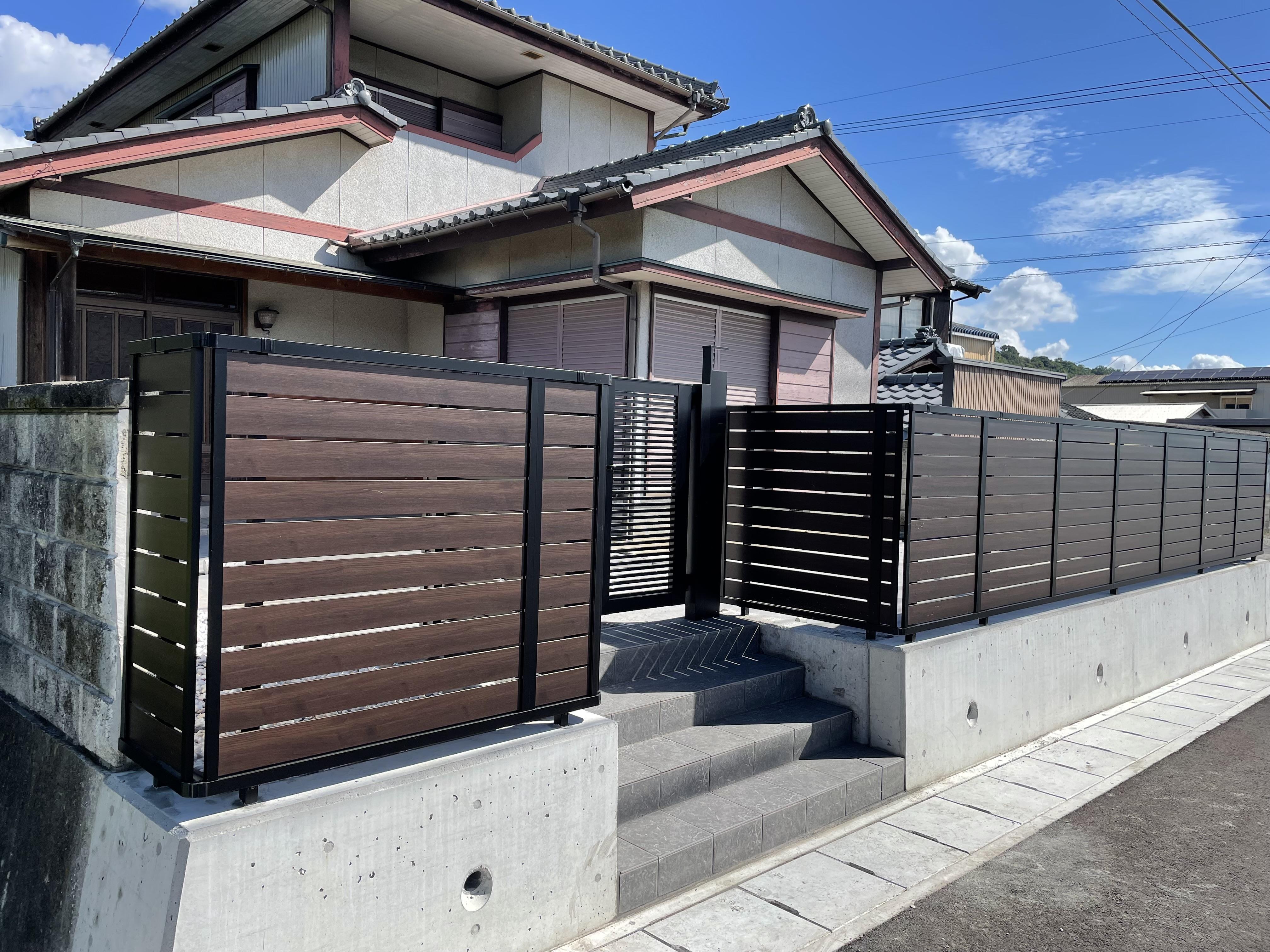 大きくなった木々を伐採しブロック塀からフェンスにリフォームしました。 階段にタイルを貼ることで高級感もアップしスッキリしたお洒落な外観に変身いたしました。 商品名:フェンスAB