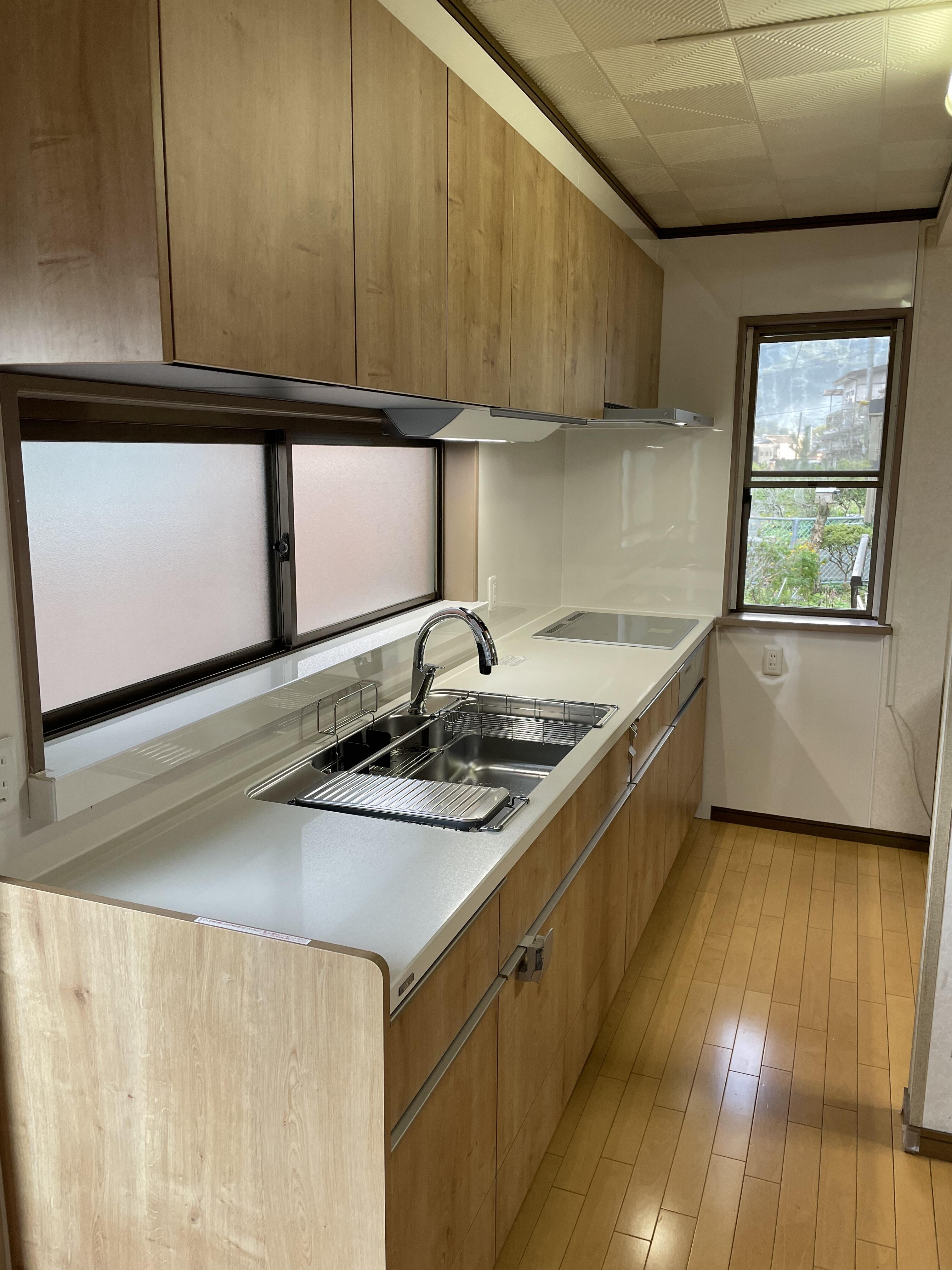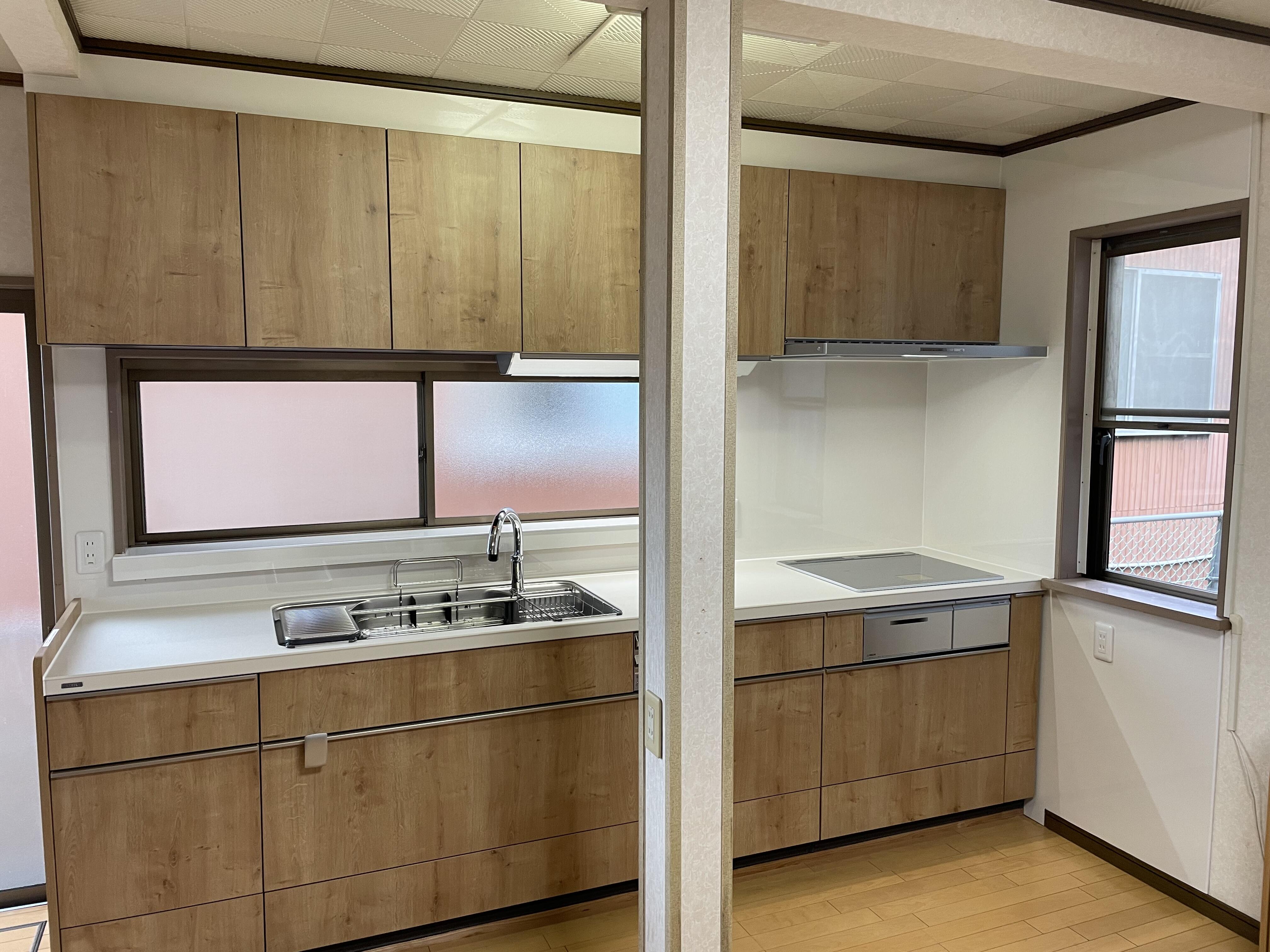 木目調のキッチンがとってもおしゃれで、吊り戸と柄を合わせることで統一感のあるキッチンに仕上がりました。