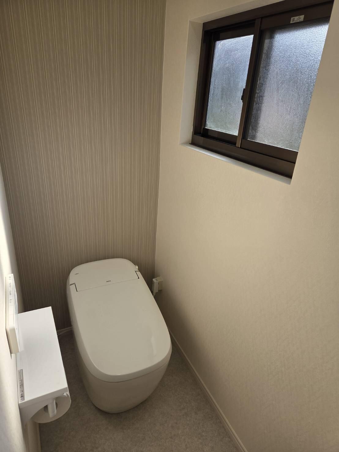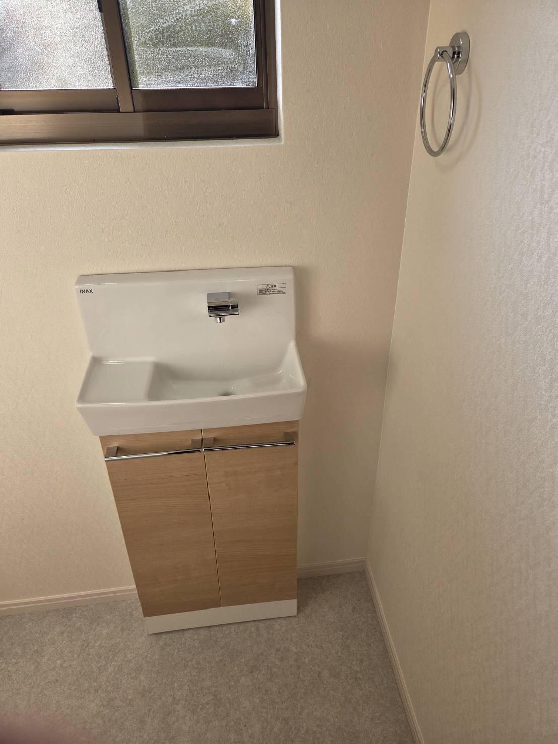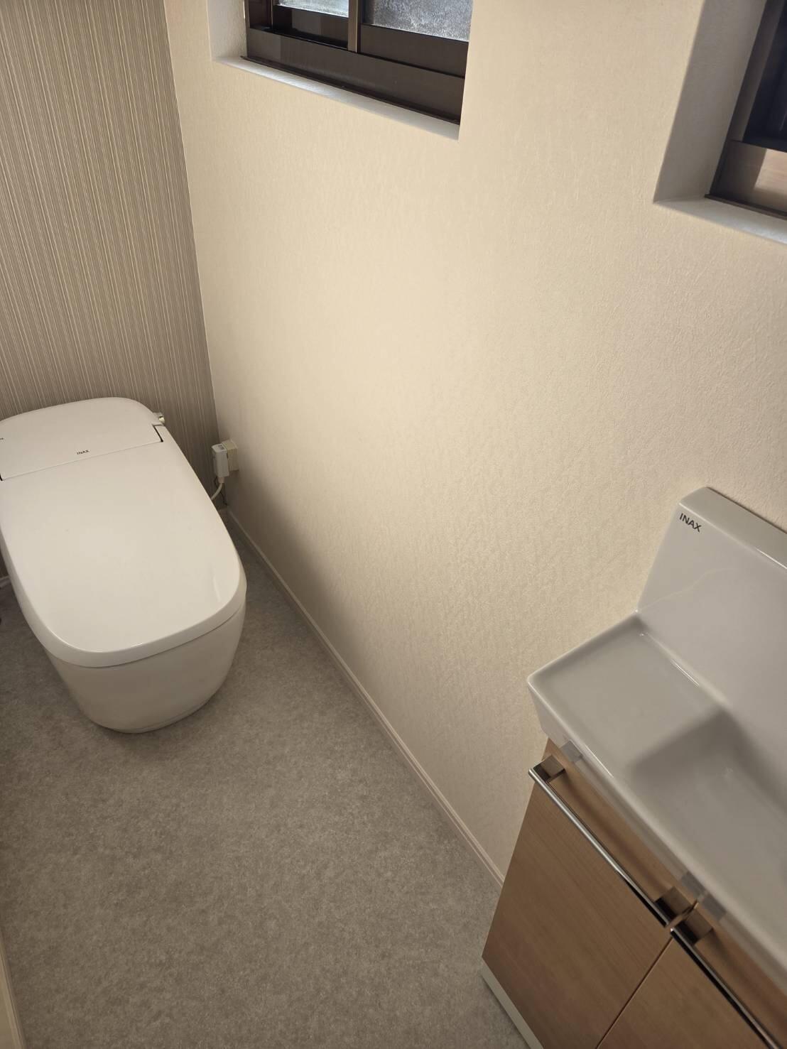床のクッションフロアとペーパーホルダー、手洗器をリフォームさせていただきました。 長年使っていると、お掃除ではなかなか取れない汚れがでてきます。 そこで、思い切って壁紙、床の張替をするとトイレ空間が明るく、お掃除しやすいストレスフリーな空間に変身致しました。 タンクレストイレで室内も広く使うことができます。