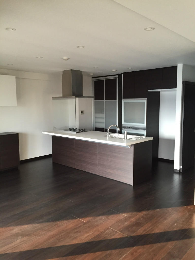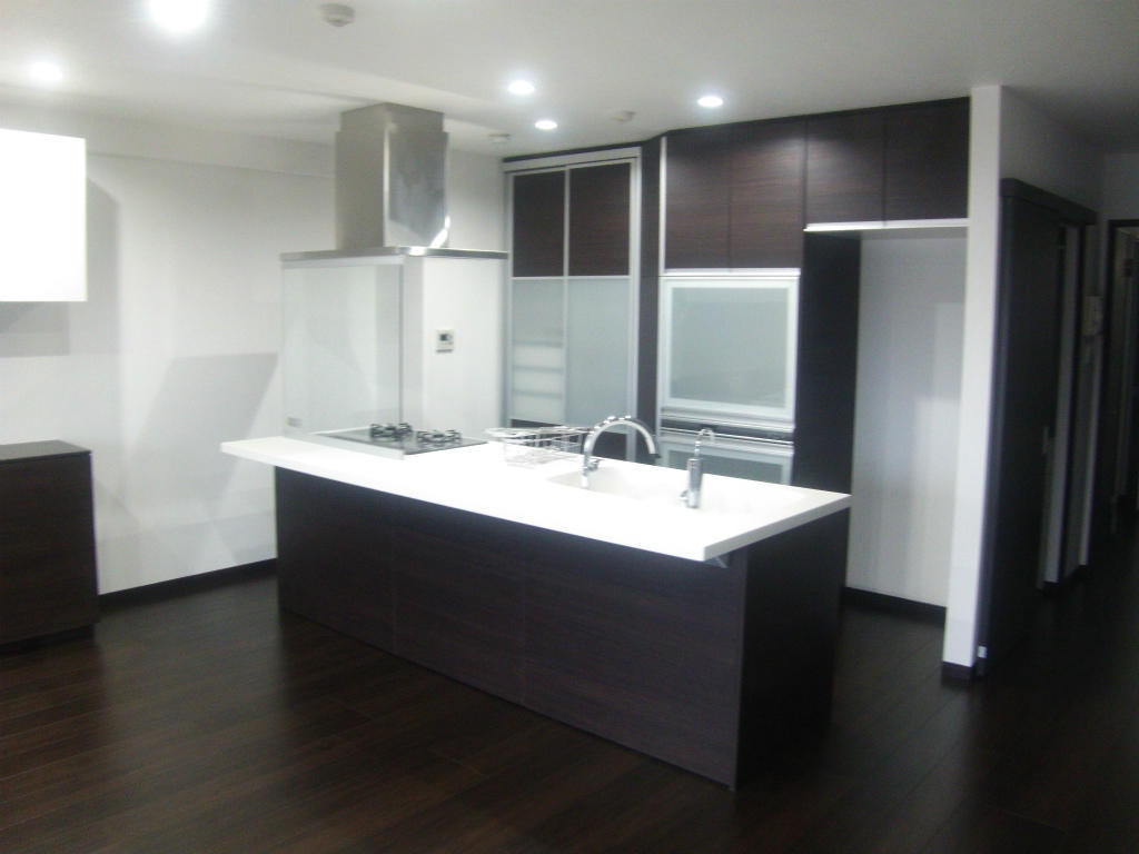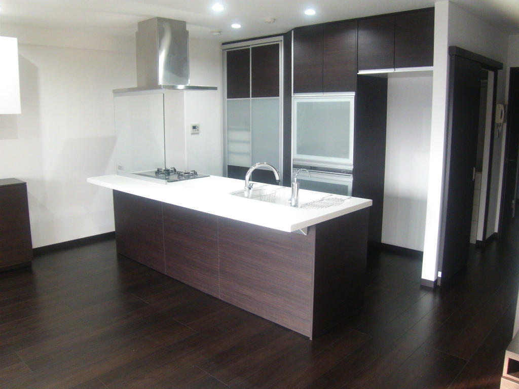 キッチンの扉も他の建具や床材と同じクリエダークにすることにより統一感が出ました。元々対面キッチンだしたが、コンロ前には壁があり、対面とは言えどシンク前に小さい開口がある程度でした。そのコンロ前の壁を無くした代わりにガラスを設け、油跳ねにも対応しています。間取りが変わったので、キッチンの位置も後ろのカップボードとの間隔をみて微妙に変えてます。