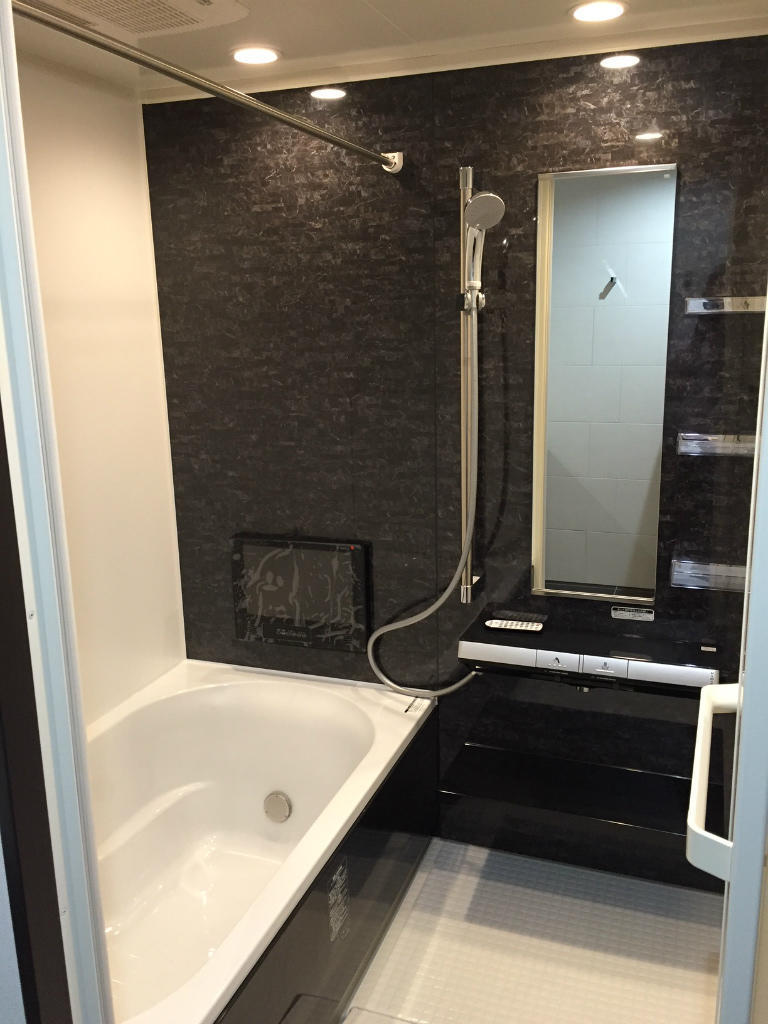 お風呂もトイレと同様、黒が基調の高級仕様。今時の方なので、というのが当てはまるかどうかわかりませんが、お風呂にテレビも付けました。工事前は脱衣場との段差があったのですが、リノビオに変えて段差も無く、バリアフリーになりました。