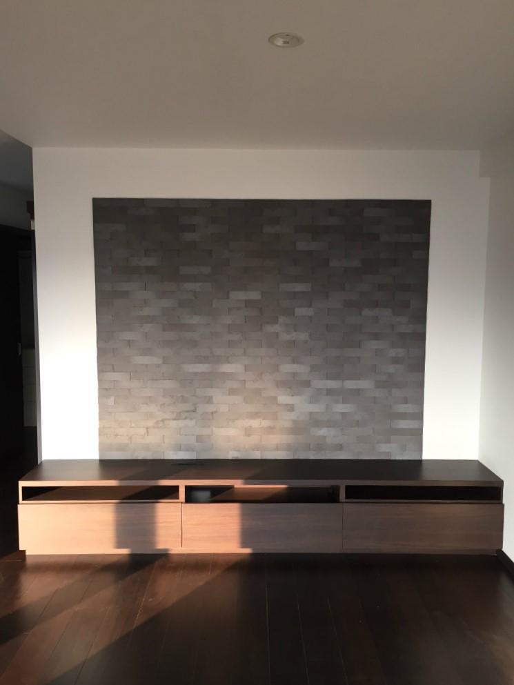 テレビが来る後ろにはエコカラットプラスを貼りました。エコカラットプラスというと調湿効果や、脱臭効果を期待される方が多いですが、今回のお施主様は何はともあれ見た目重視(笑)これもやっぱり黒でカッコよく仕上がりました。テレビ台もヴィータスを採用いただき、据付けにしました。