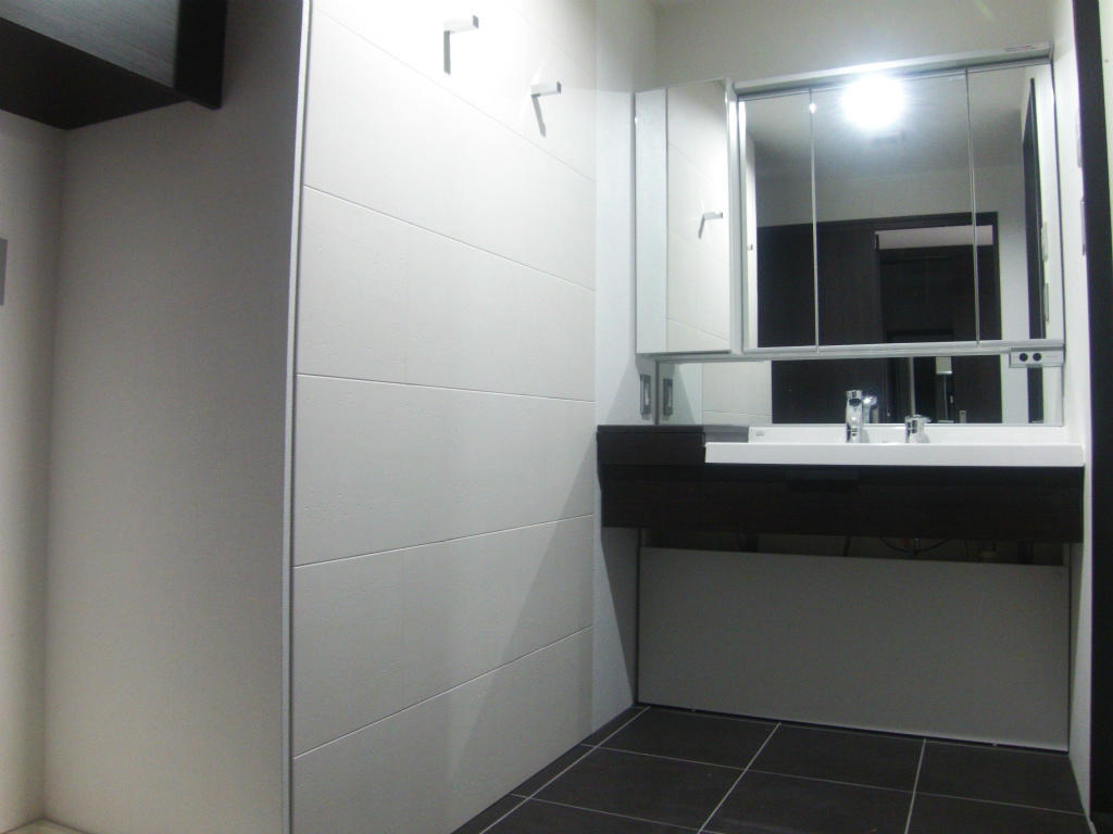 洗面化粧台の大きさは以前と変わりはないですが、何より豪華になりました。鏡の裏に充分収納スペースがあるので、下台はあえてシンプルに。ここの側面一面にもエコカラットプラスを貼りました。このエコカラットプラスは機能重視。上にタオルハンガーを付けているのですが、ここに使ったタオルをかけてもエコカラットプラスが水気を吸収することを期待してます。トイレ同様床をタイルにして高級感アップです。