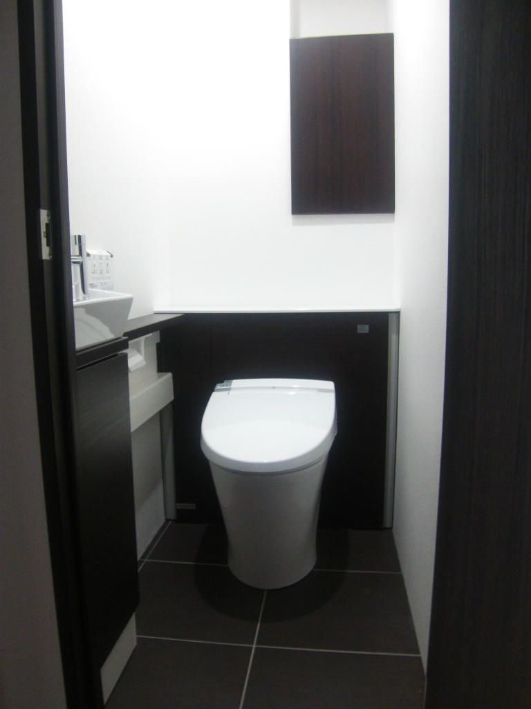 床をタイルにし、高級感を出しました。リフォレなのでトイレそのものにも収納量はありますが、トイレの上のデッドスペースも特注の建具を付けてトイレットペーパーなどが置けるように。また、手洗いの下にも収納をとりました。マンションで手洗いを別に設ける場合にはトイレの給排水を兼用できるこのようなタイプに限定されます。床と木部は黒っぽいもので、トイレや手洗い、壁は白でコントラストを付けました。