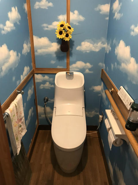 シャワートイレ(LIXILでは世間的に「ウォシュレット」と呼ばれているもののことをこう呼びます)が壊れたし、この際だからとのことで便器そのものの交換のご依頼です。トイレの掃除が億劫とのことでおすすめしたのが、LIXILのアクアセラミック製のトイレ。メーカーの方の話によると、水垢が付かないような素材にすると逆に油汚れ(便)が、便が付かないようにすると今度は水垢がどうしても付いてしまうそうなんです。そのメカニック的な仕組みまではわかりませんが、とにかくその2つの汚れ両方とも付かないという矛盾する素材を編み出したのが企業努力。ちなみにライファ今治の事務所のトイレももちろんこのアクアセラミックのトイレですが、設置してからこのかた便器の中を掃除することがありません。掃除をしなくてもいいというわけではないですが、それぐらい汚れが付かないトイレなんです。で、前回も登場しましたが、手洗いが必要とのことで、そうなったらプレアスHSですよね。このお宅は2階にもトイレがあるので、工期には余裕がありました。まずはトイレを外して、天井にクロスが貼れるように大工さんに下地を作ってもらってから天井と壁のクロスを貼替えます。今回のこのビニルクロスですが、お施主様が「空を見てたら亡くなった主人に会える気がして」という涙無くしては語れないお話をしていただき、選んでもらいました。余談になりますが、トイレを外した際に今回は床はやり替えない旨伝えていたら、水道の職人が洗剤をシュッシュとして「こんな時しか掃除できんやろ」と掃除してくれました。自社の職人を褒めるのも気持ち悪い話ですが、こんなところまで気が利く職人はそうはいません。お施主様にも喜んでいただきました。