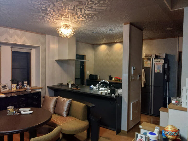 リフォーム前はキッチンとダイニングが壁で仕切られていましたが、オープンなレイアウトにしたことで、空間が広がり、開放感が出ました。また、リフォーム後は黒を基調としたシックでモダンなデザインになっており、全体的にインテリアが洗練された印象を与えます。キッチンカウンターや収納も統一感があり、インテリア全体がすっきりとした見た目になりました。