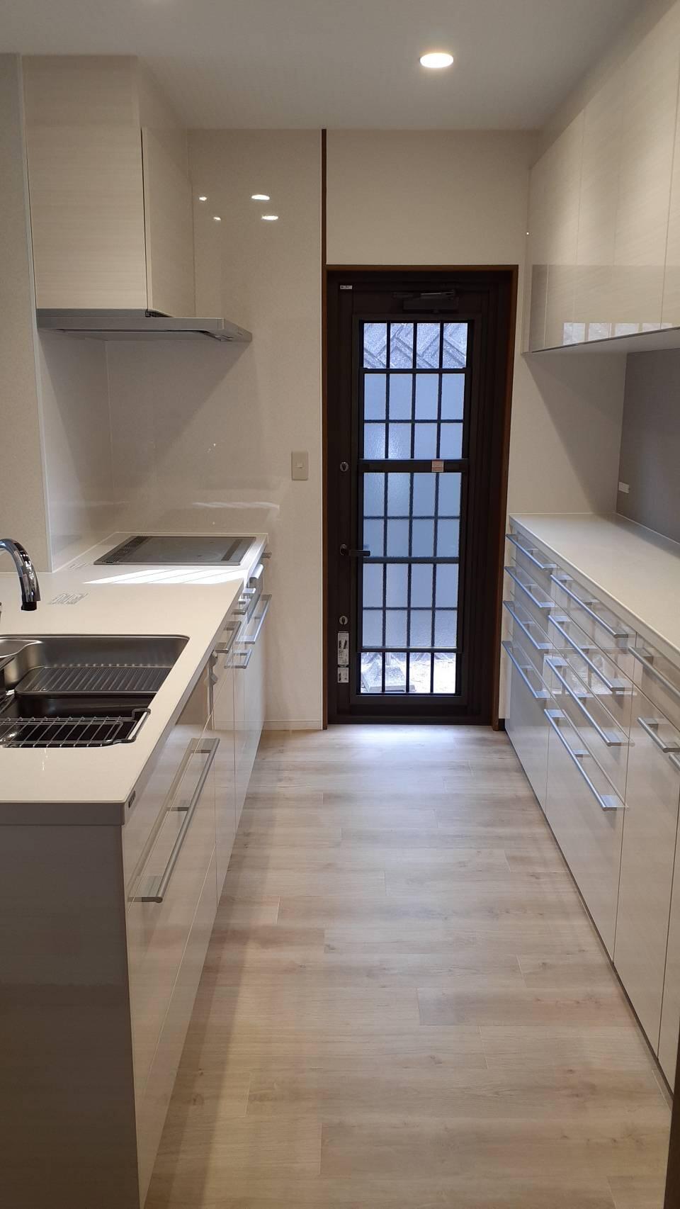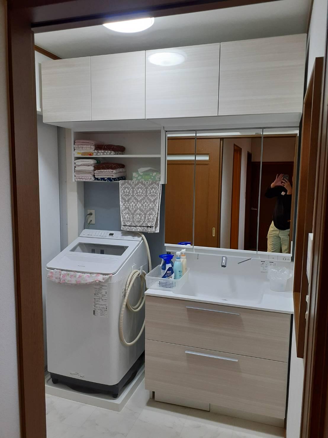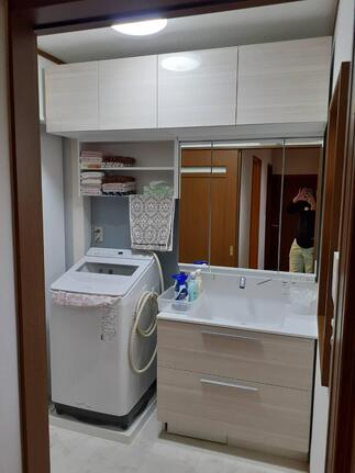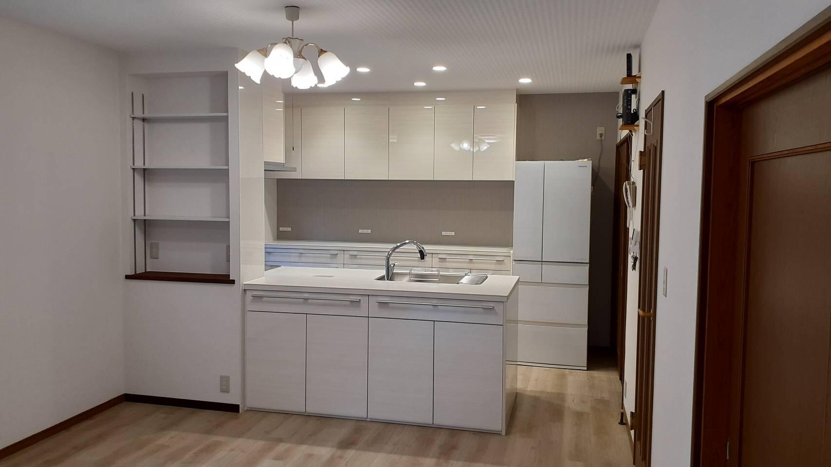LDK・洗面脱衣室・浴室をまとめてリフォームしました。暗く閉鎖的だったキッチンは、対面式のオープンなレイアウトに変更し、白を基調とした明るく清潔感のある空間に一新。収納力も大幅にアップし、すっきりとした印象になりました。洗面脱衣室には吊戸棚とオープン棚を設け、タオルや日用品も整理しやすく、洗面台も広く使いやすいものへ交換。暮らしの中でのちょっとした不便が解消され、毎日の家事や身支度が快適になりました。統一感のあるデザインで、全体的に明るく温かみのある住まいに生まれ変わりました。