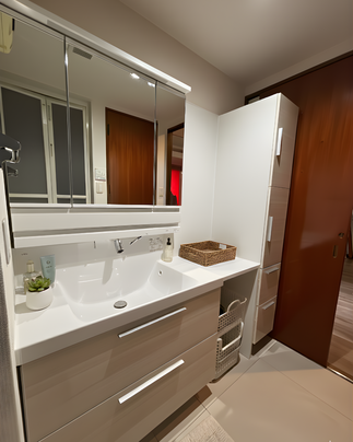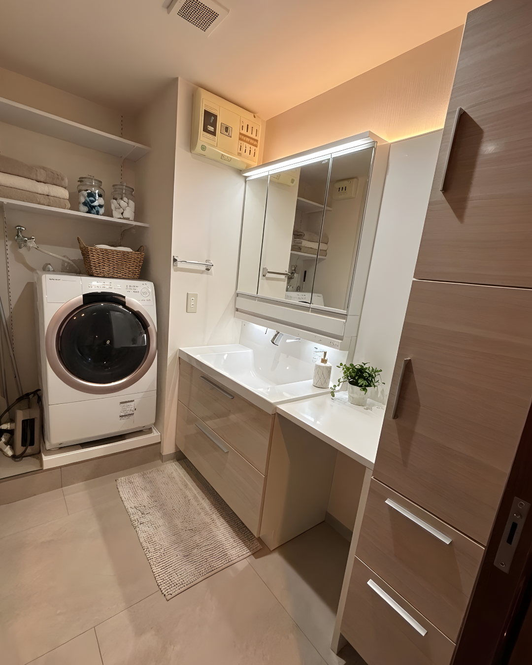 収納面では、壁面のデッドスペースをフル活用できるよう、高さがあるトールキャビネットを設置しました。パジャマやタオル、洗剤のストックなど、出しっぱなしになりがちな生活用品をすべて扉の中に収めることで、視覚的なノイズをなくし、ホテルのような静謐な空間を実現しています。一方で、洗濯機の上部にはあえてオープンな可動棚を設けることで、よく使うアイテムへのアクセスの良さという実用性も両立させました。