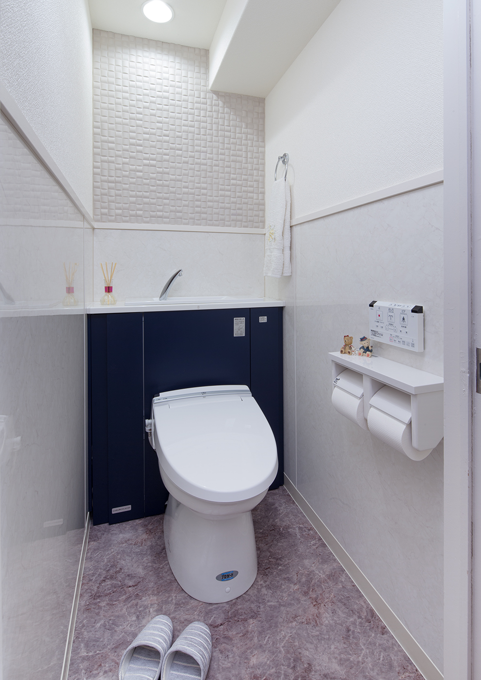 収納付きのPitaシリーズ 腰壁はお手入れのしやすいパネル施工、上部はエコカラットを貼りました。