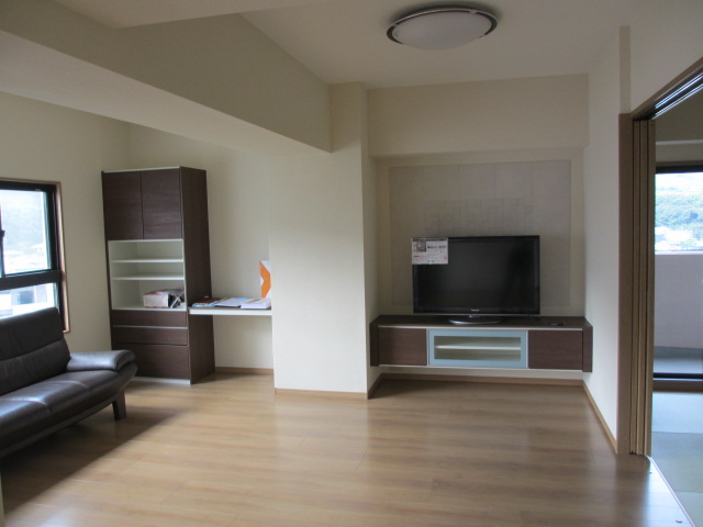 建物の躯体柱を利用し、TVボードとパソコンデスク、収納庫を設置しました。