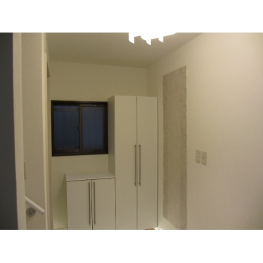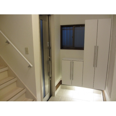中古住宅の全面リフォーム 玄関部分は、下駄箱を大きくしたいと言うお客様のご要望でした。玄関のたたきが狭くならないように、下駄箱を浮かせて取り付け、収納力もアップしました。 ダークカラーの建具、収納家具、床材をホワイト系に全面変更し、明るく素敵なおもてなし玄関ホールになりました。