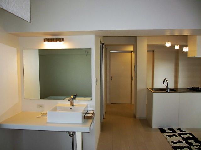 中古マンションの間取りを大胆に変更して洗面台をリビングに配置し、機能性を重視したリノベーションを提案しました。