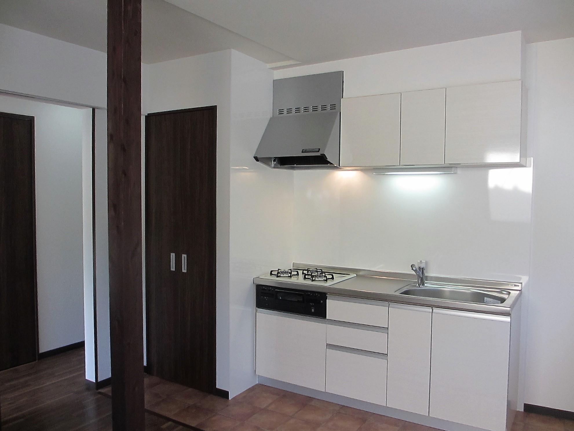 急な屋内階段の玄関を止め、ダイニング角の間取りを変更して玄関と廊下を設けて2階から出入りするようにし、繋がった和室もフローリング化して広く使えるようにしました。また状況に応じて子供部屋にも利用できるように、光を通す3枚の間仕切りを設けました。これで賃貸物件として色々なニーズに対応できるようになりました。