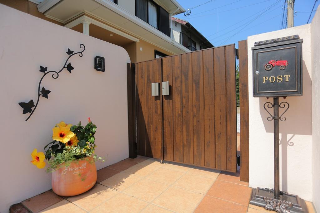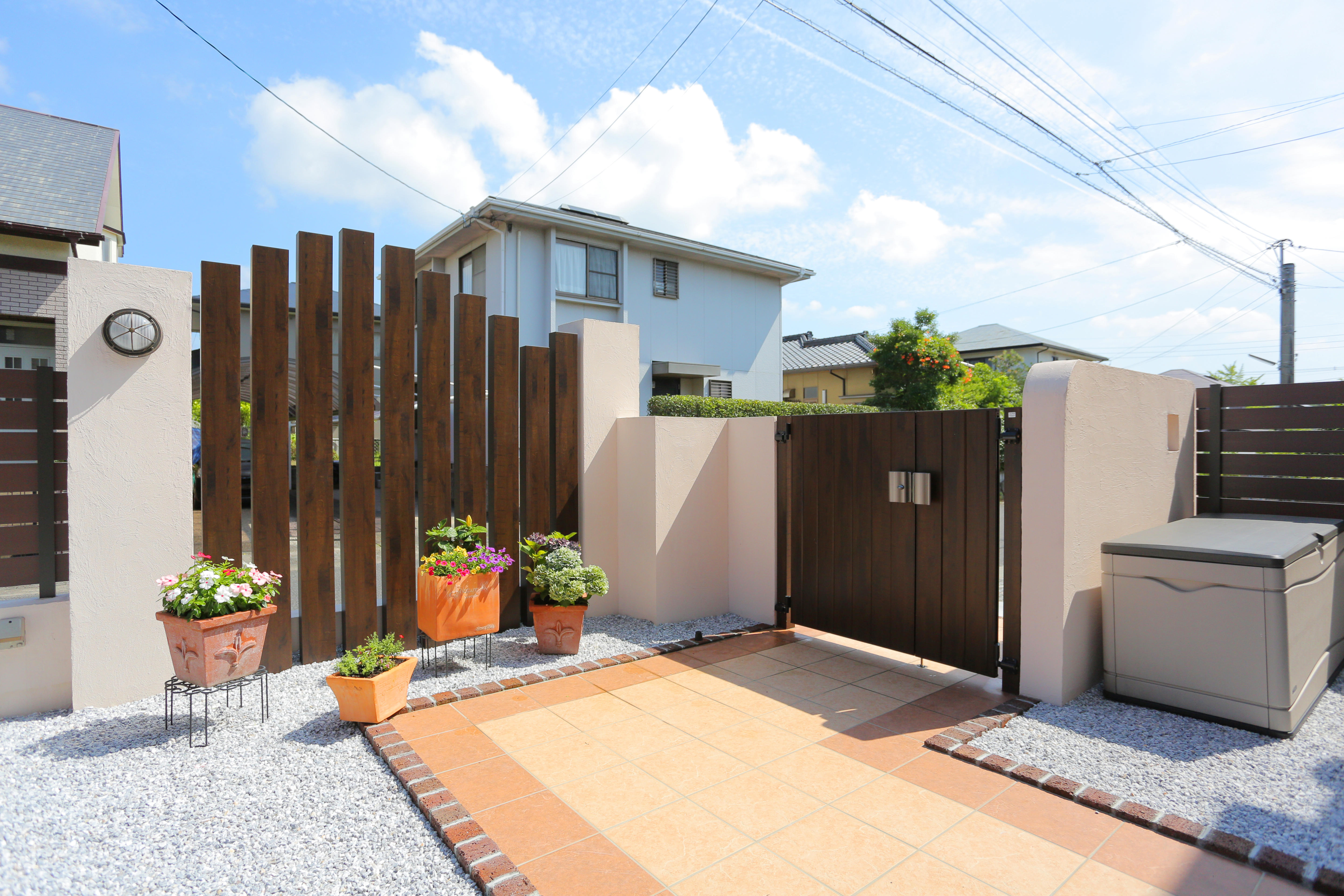 「愛犬たちと安心して遊べるお庭を造りたい」とご相談いただいたことがキッカケでした。お打合せを進めるなかで、「このようなデザインが好き」と沢山写真をご準備してくださったり、門まわりのアイテムでも楽しむなど、ひとつひとつA様のこだわりを感じる素敵なデザインで仕上げることができました。木目調のフェンスとリズミカルに並ぶ枕木材もポイントです♪
