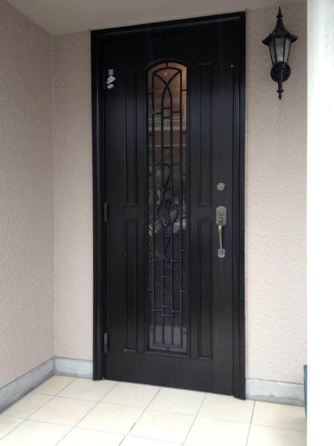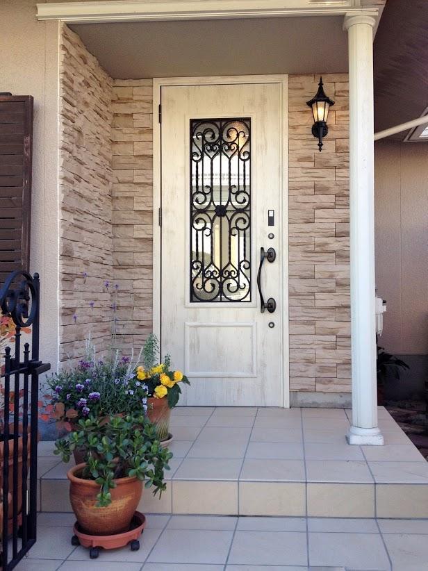住宅街の中古物件を購入されたF様。奥様好みの「フレンチテイスト」を目指して徐々にリフォームでお手伝いさせていただいております。アルミ色だった玄関扉は、シャビーシックに仕上げたLIXILの玄関ドア(C13型)をチョイスしています。丸みがあるデザインのアイアンも可愛いですね♪