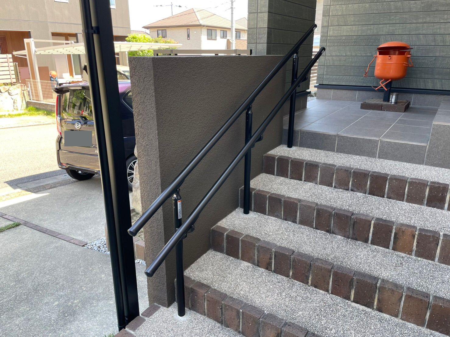 小さなお子様やご両親のためにも、階段部分には手すりも取り付けました。しっかりと握るのに最適な太さのΦ38を採用。お住まいのサッシや樋のカラーに合わせ、マイルドブラックをチョイスし、外観の統一感も大切にしました。