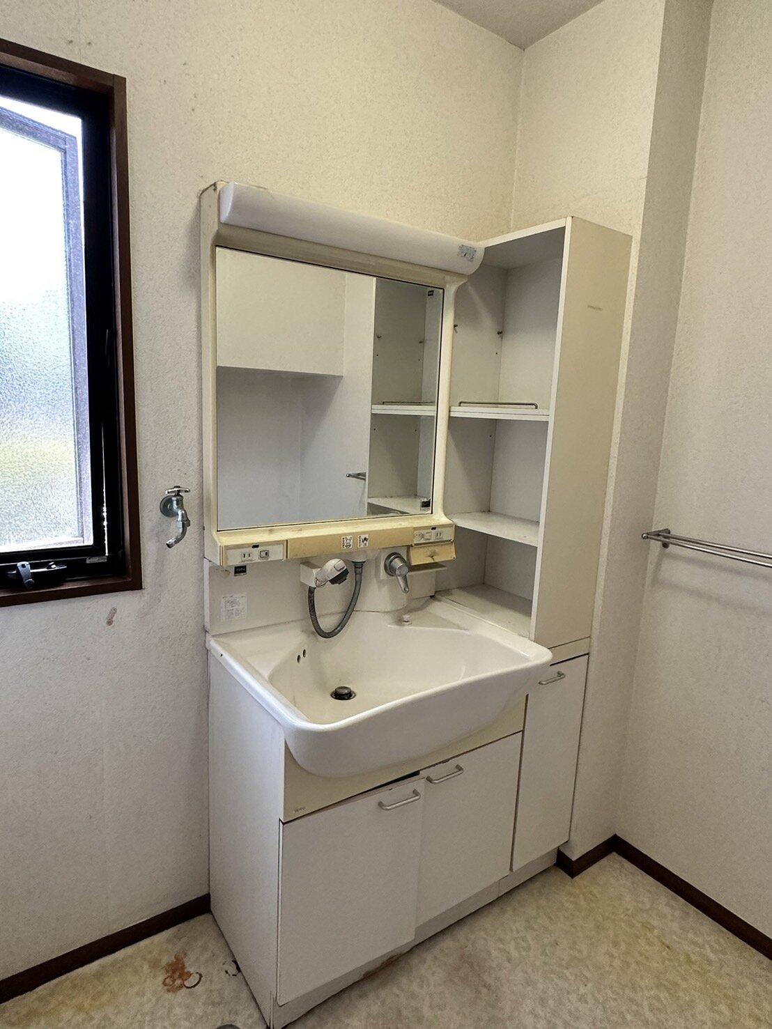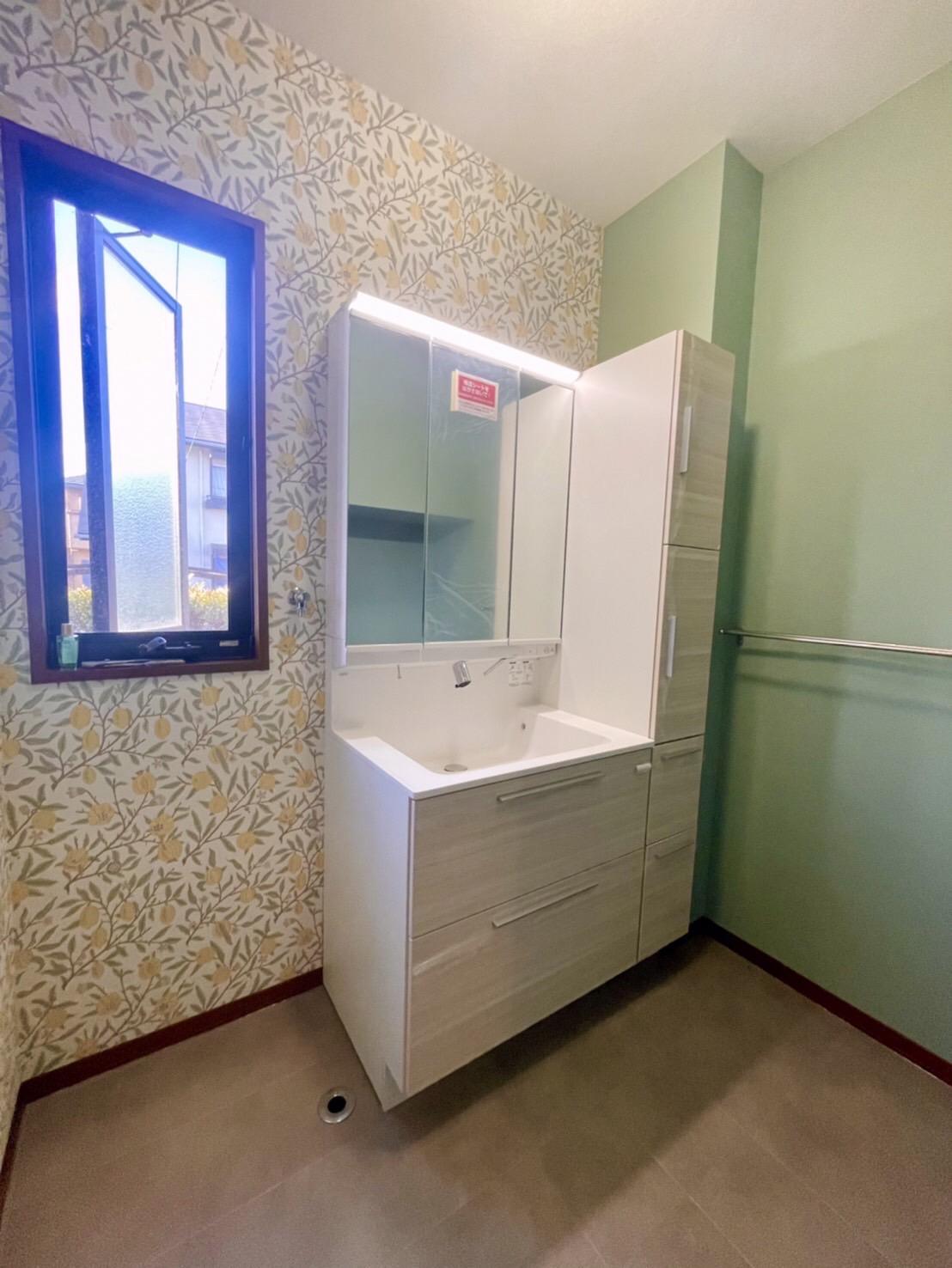 トイレのクロスと同じ柄サンゲツ「FE76001]を使用しました。 全体的に明るい雰囲気でかわいらしい空間になりました(^^)