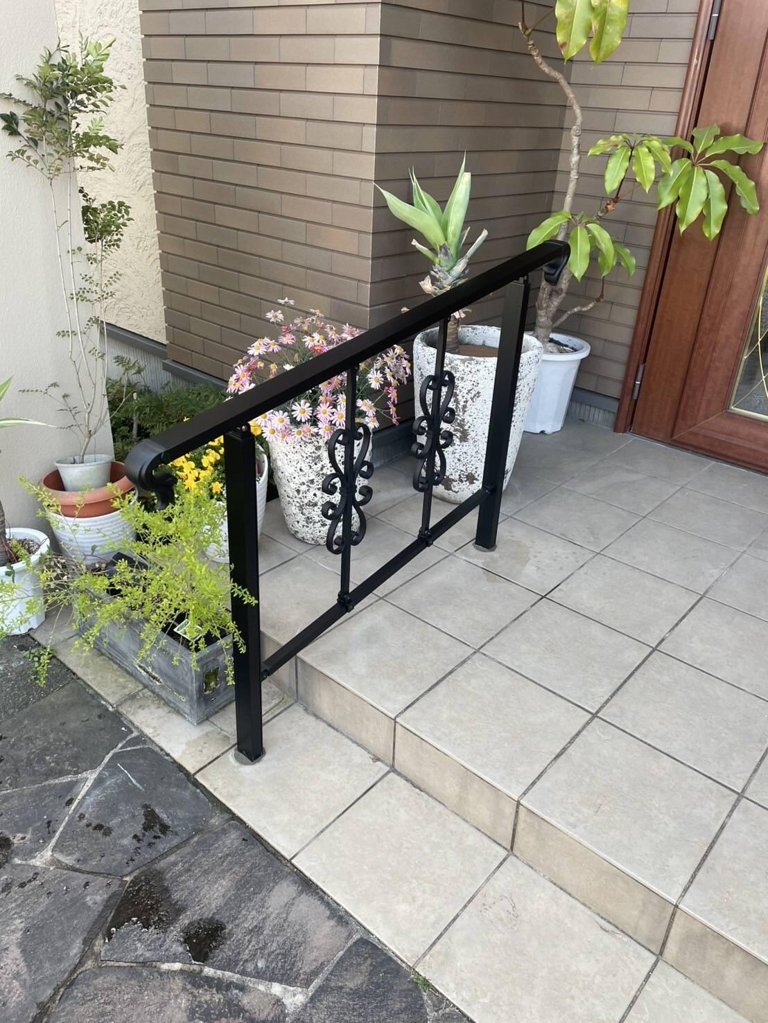 段差が気になる玄関前。 「足腰に不安がある家族のために、安心して出入りできるようにしたい」 そんなお悩みの時に... スタイリッシュで強度もバッチリなブラック手すりをご提案させていただきました