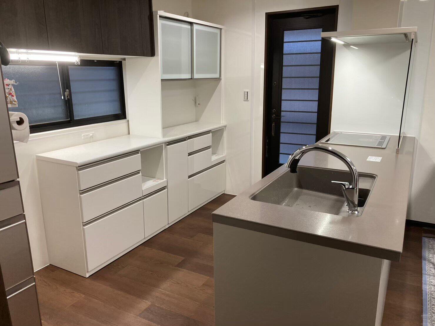 白を基調とした空間に、ダークトーンの吊戸棚がアクセントとなり、デザイン性と機能性を兼ね備えた空間に生まれ変わりました