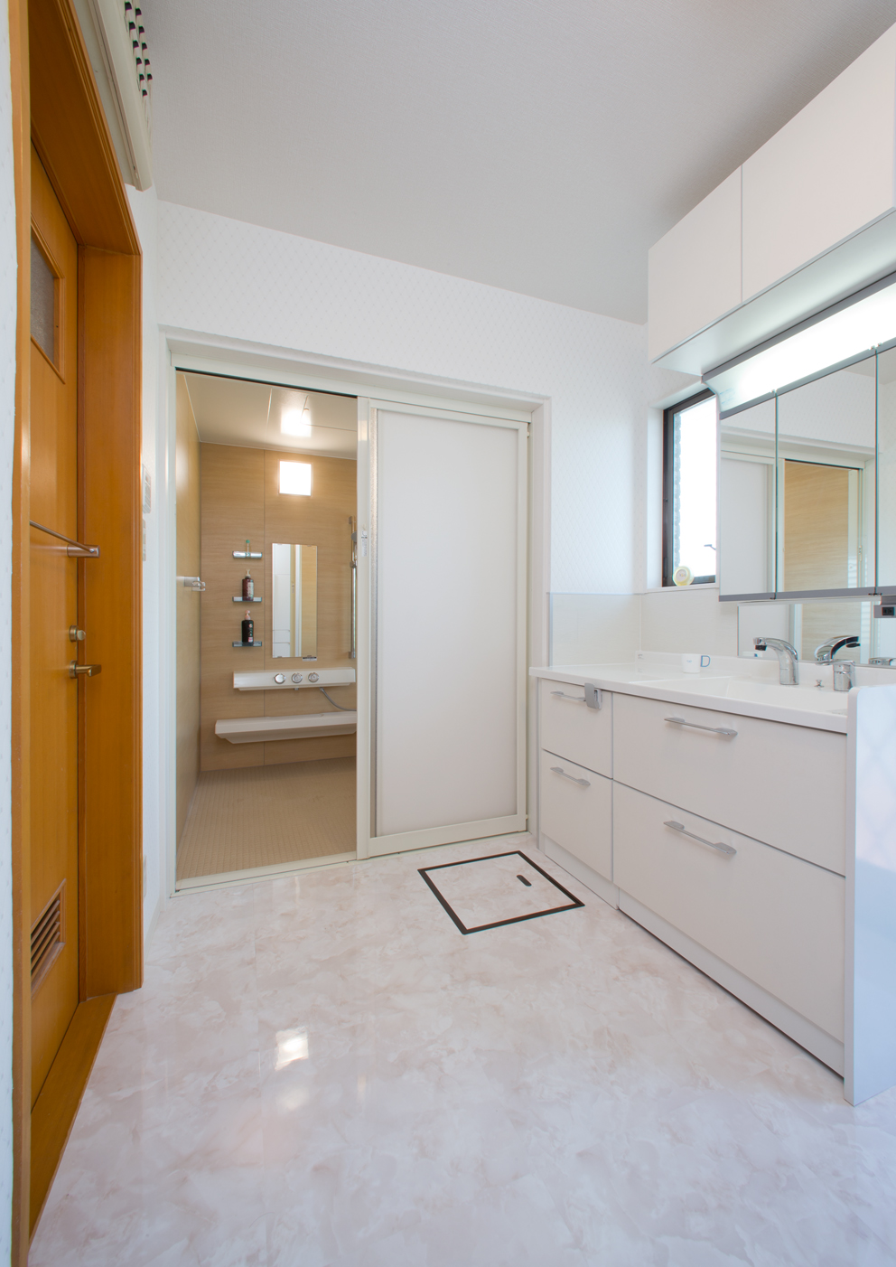 洗面脱衣室と洗濯室の仕切りを無くし、広々空間に。また、勝手口からも光が入るようになり、明るい印象になりました。