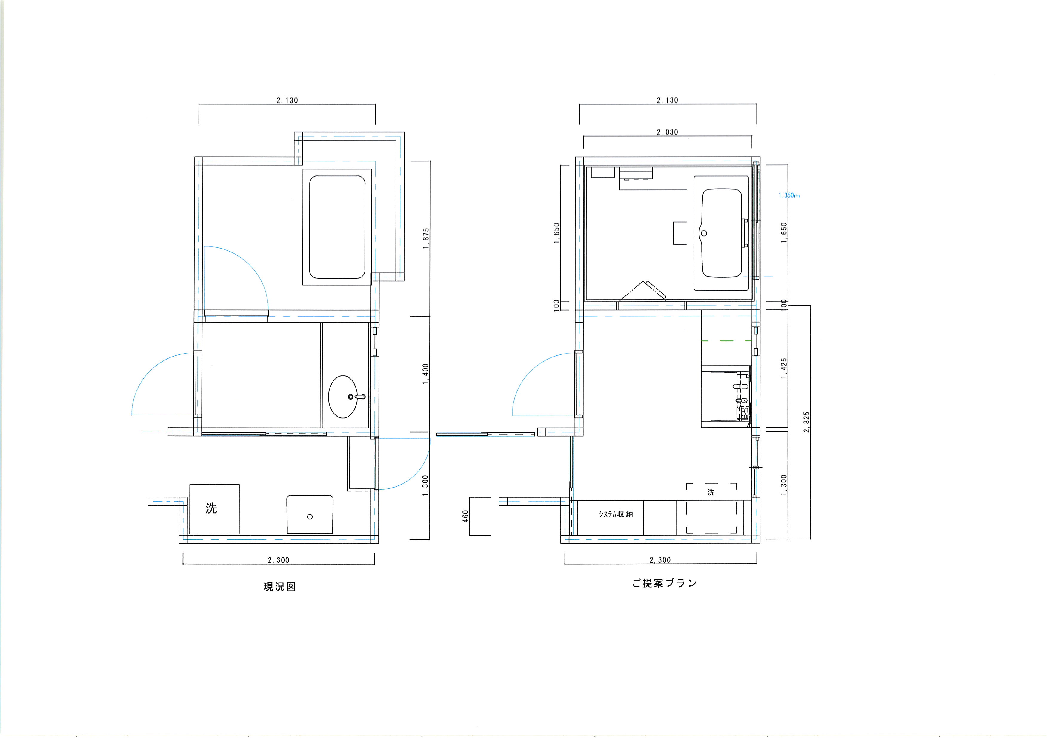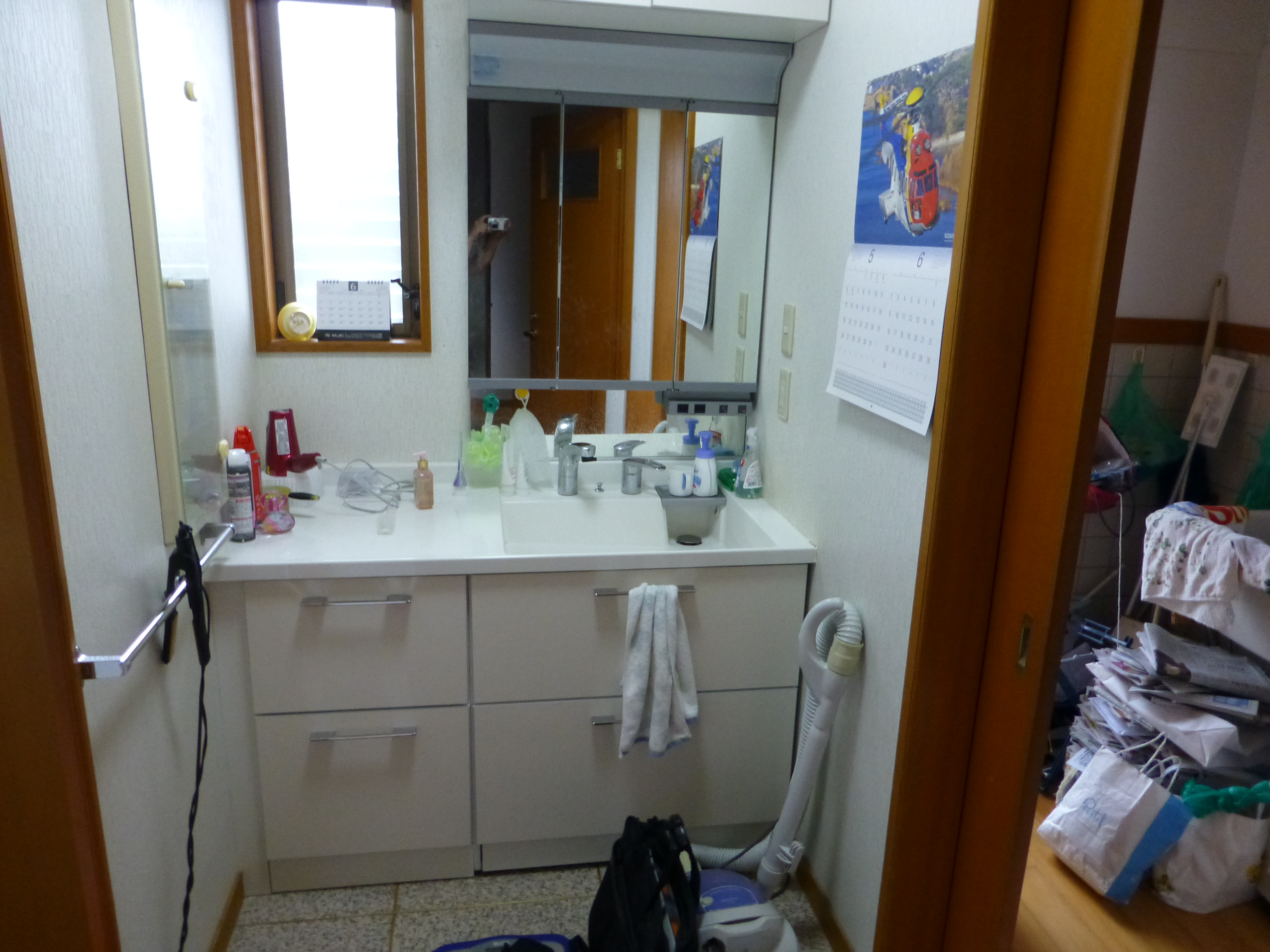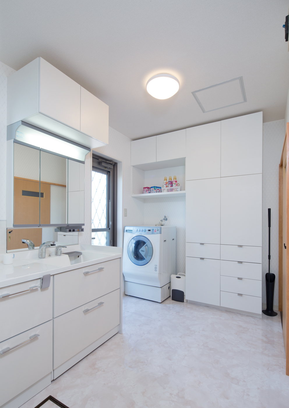 収納を増やして、物があふれる事がなくなり、また洗面化粧台と同色の収納にした事で、スッキリとした空間になりました。