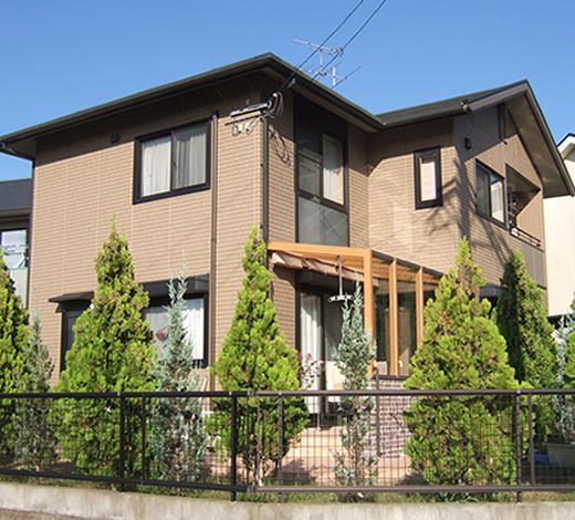 外観はナチュラル色のインテリアに合わせて、ココマとテラス床タイルの色も明るい色味に。腰壁のブリックタイルは濃い色にして、全体のイメージを引き締めました。シンプルモダンだった外観が、あたたかな風合いに変身しました!