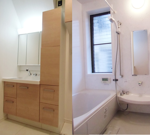 「冬場に浴室が冷える」との困りごとから始まったリフォーム計画。そこで在来浴室からユニットバスへの取り替えをご提案しました。 防犯上の事も考え、現在使っていない浴室と外部のドアも撤去し、外壁の改修も行いました。また、収納量が不足気味であった洗面脱衣室にアッパーキャビネット・背面収納を提案し、収納力が大幅に増え、すっきりしました。