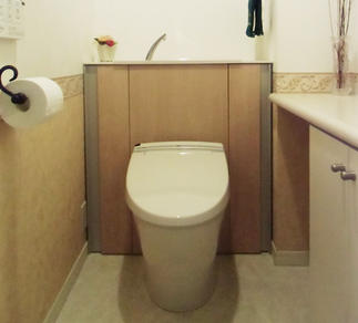 「トイレ内の収納の充実」と「トイレルームのデザイン性を更に高めたい」というご要望のもと収納型トイレ「エレシャス」に決定しました。 既存のクロス色と扉収納の色がマッチしてより快適なトイレ空間になりました。
