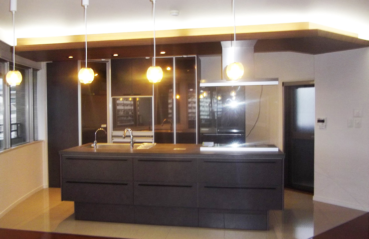 キッチン〈リシェル SI〉の美しさと使いごこちへのこだわりに着目してご提案しました。 またキッチン周りの照明もこだわり、天井下空間照明を設置したことで、存在感のあるリビング・ダイニングに仕上がりました。