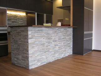 お客様のご要望でキッチン収納奥の壁とキッチンカウンターの腰壁をタイル張りにすることにより