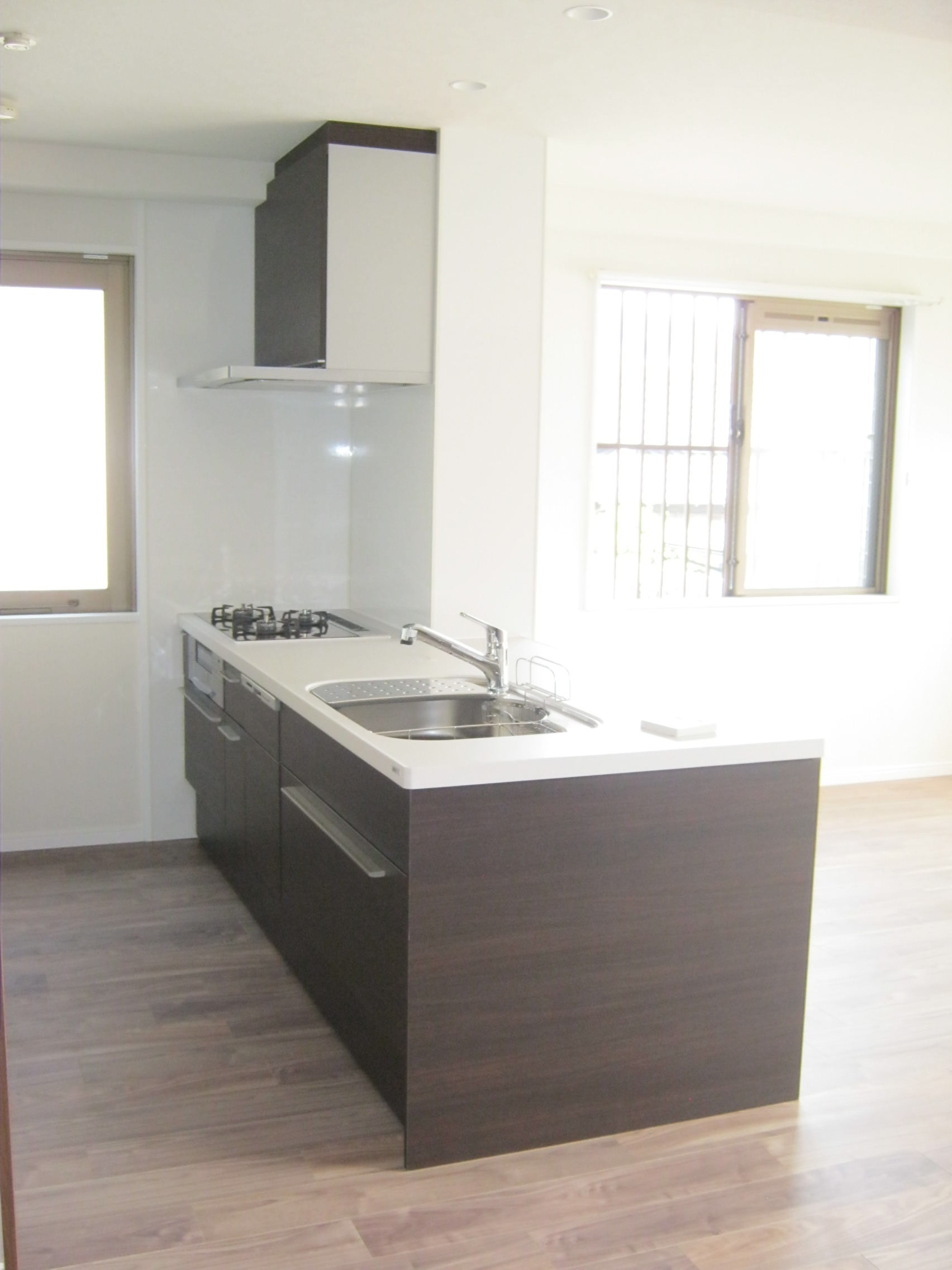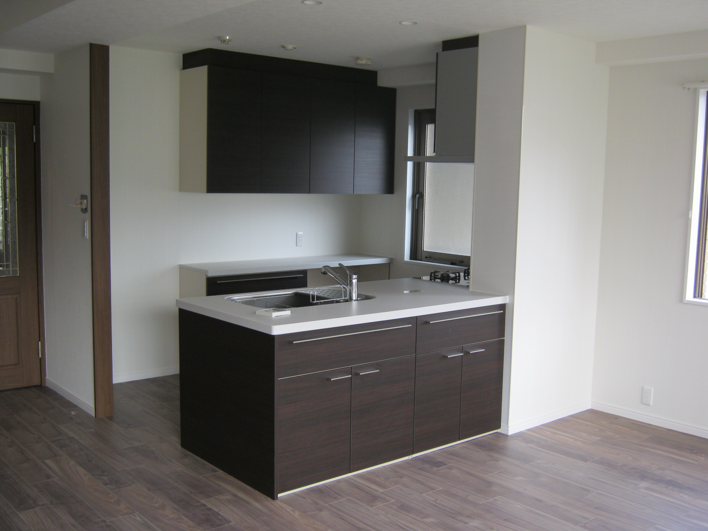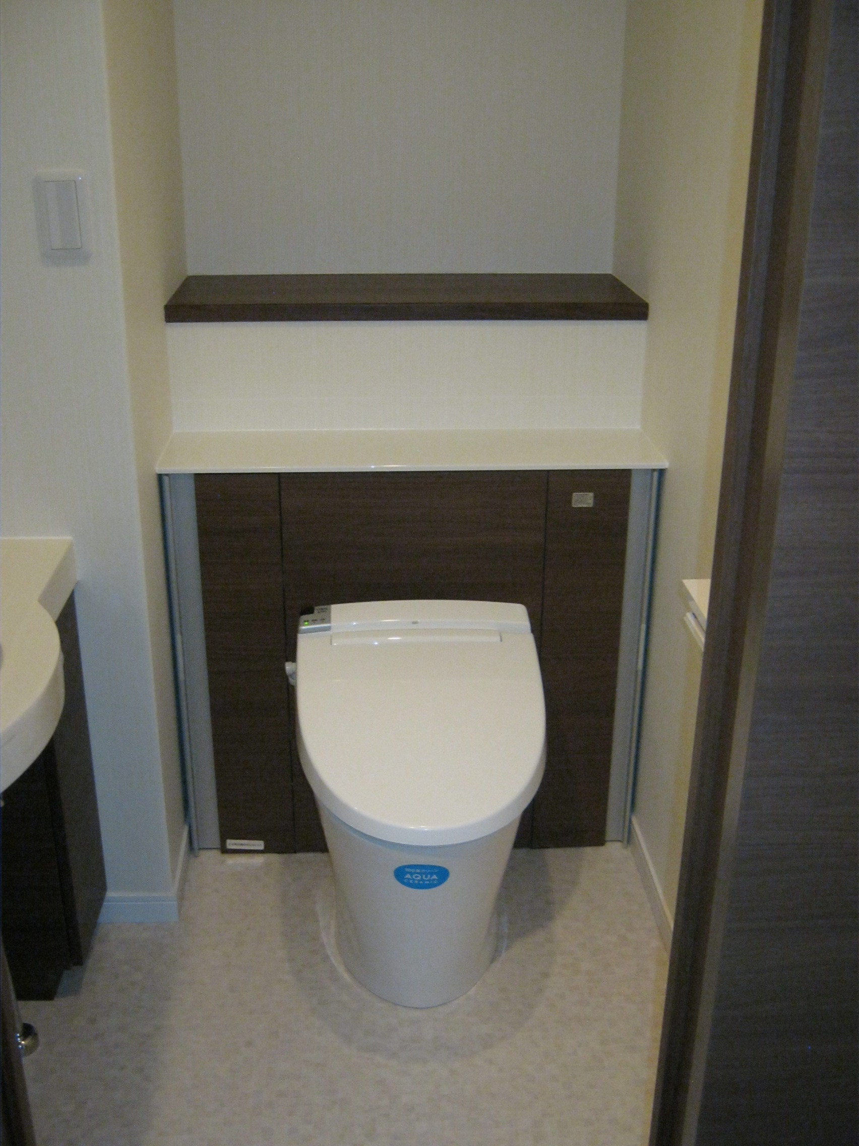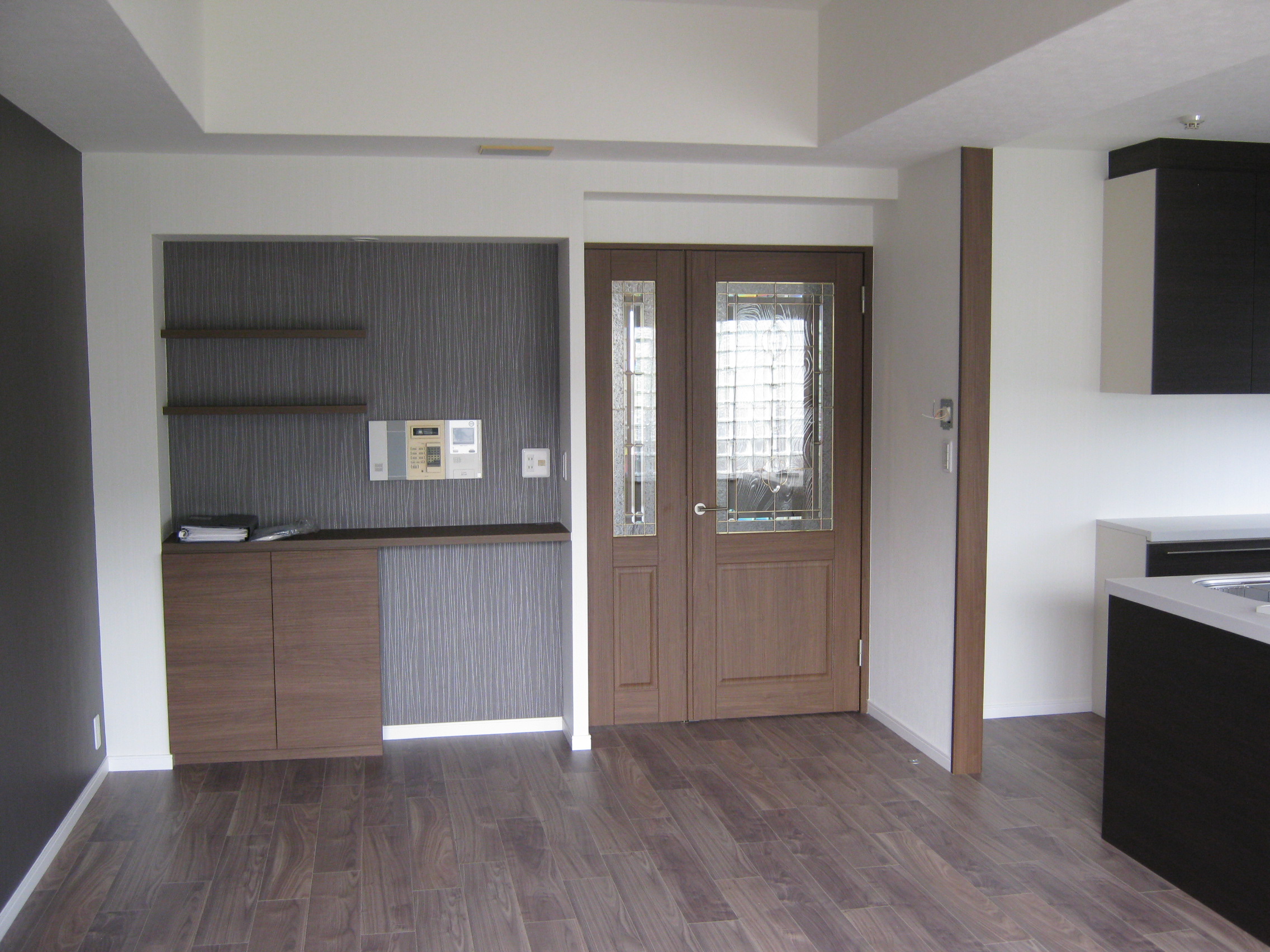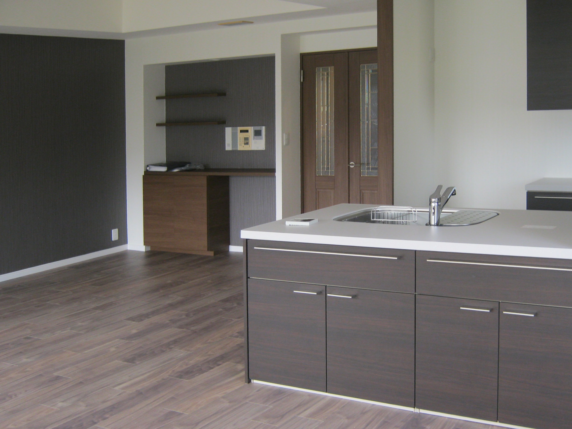 キッチン〈リシェル SI〉の美しさと使いごこちへのこだわりに着目し、 トイレはお掃除のしやすさも、見た目もすっきりとしたデザインのリフォレをご提案しました。 床や室内ドア、収納棚もキッチンと統一感のあるダークブラウンに統一しおしゃれで落ち着いた印象のリビングになりました。