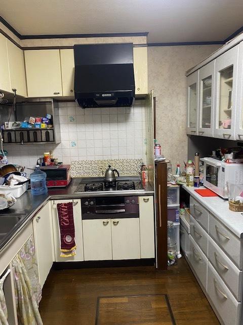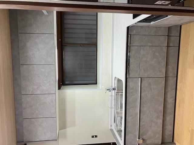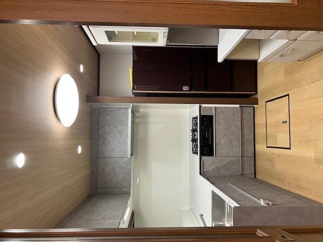 今回のポイントは、なんと…「すべておまかせプラン」です! お客様から仕様もお任せされ、担当者のこだわりがつまった工事となりました。 扉には流行りのグレージュスタッコを採用し、 木目調の天井クロスとダウンライトで洗練された明るいキッチンになりました。 コンロ横は、油はね防止のため天井まで壁を造作しました。 これでお掃除もラクラクです。