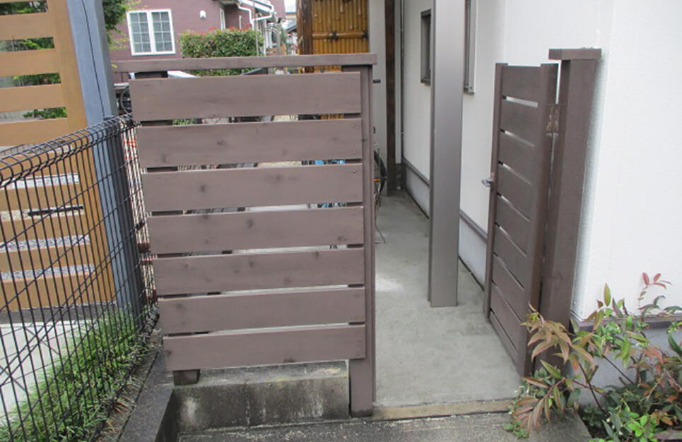 既存の門扉・フェンスと同じようなデザインがお好みとのことで、柱・枠なども木目調の門扉AAとフェンスAAをご提案しました。 門扉とフェンスの取付位置の変更については、既存のブロックを撤去し、新たにブロックを新調し対応しました。 施工当日、雨が降ったり止んだりの不安定な天候でしたが、無事、予定通りの日程で工事が完了できました。