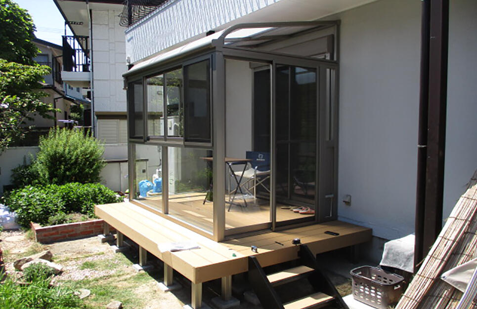 LIXIL福岡ショールームへご来場されて、お洗濯物を2階のバルコニーまで持って上がるのが辛くなってきたので 1階の和室の前にサンルームを設置したいとのことでした。