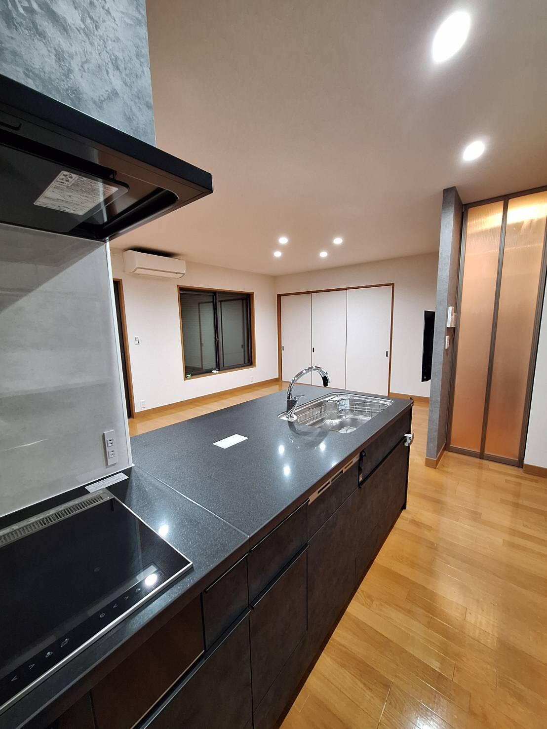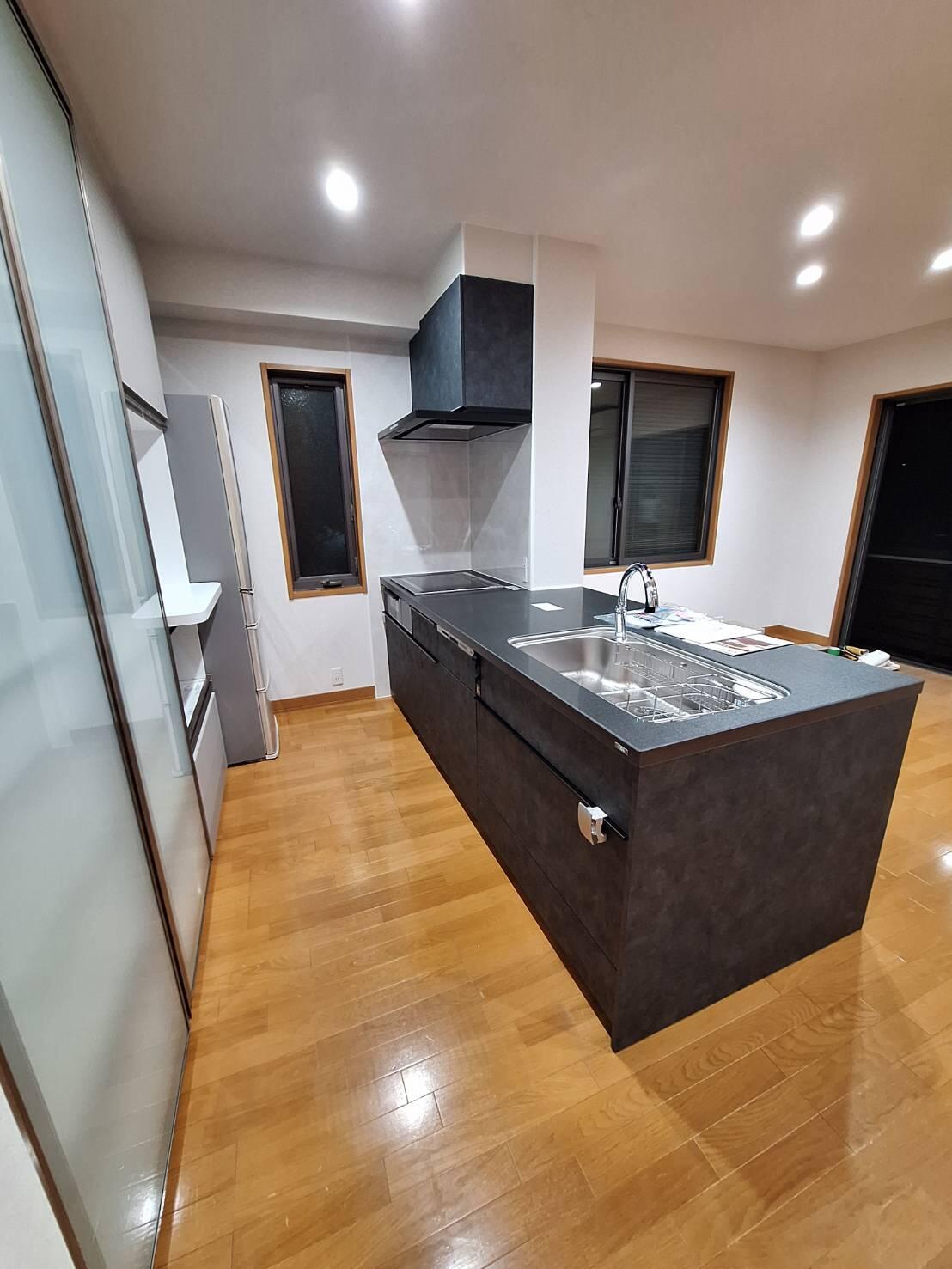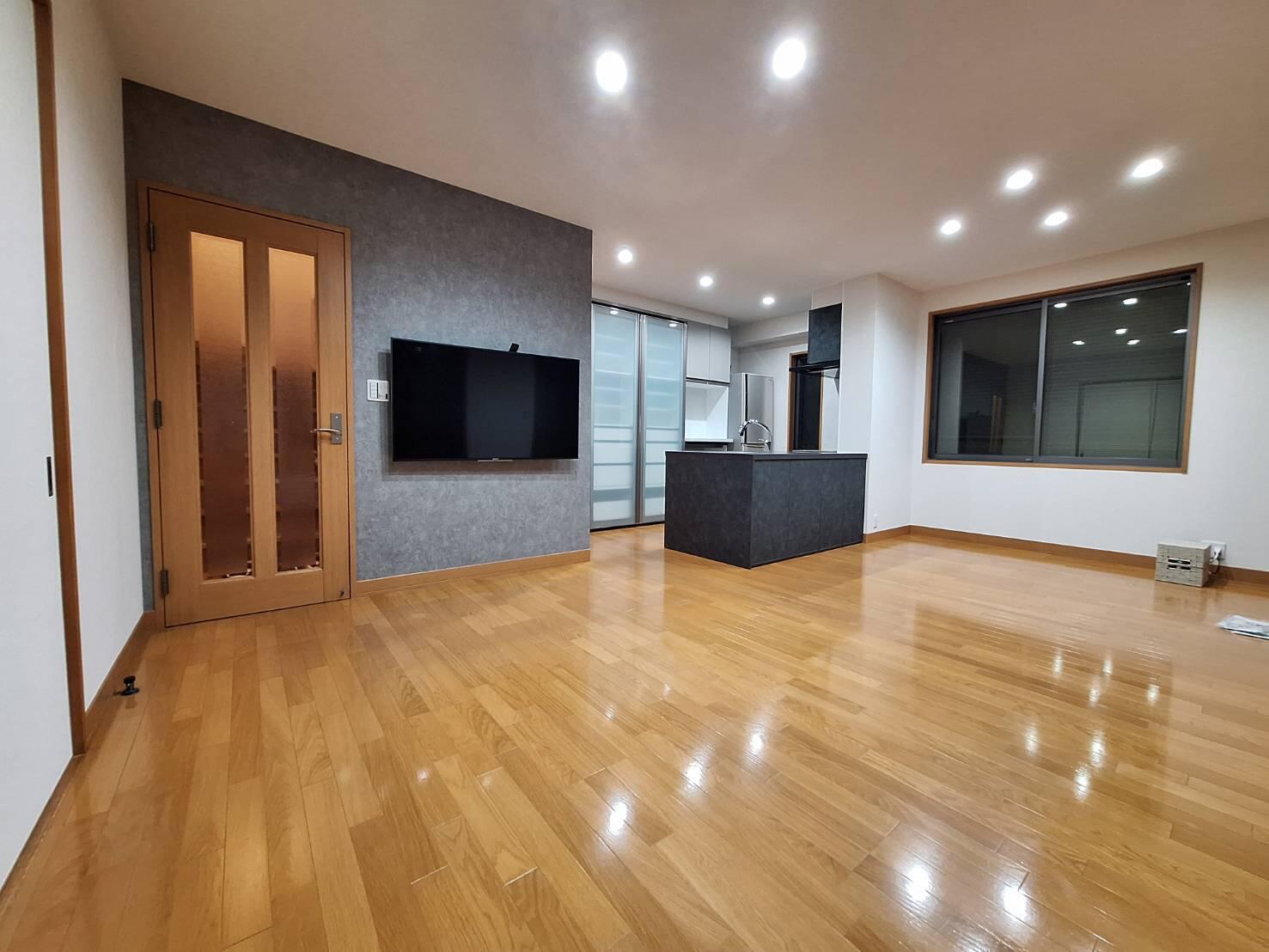 キッチンをリシェルへ。 背面の収納も取替、横の壁を取ってすっきり見晴らしのよく明るい空間へ。 クロスもキッチンに合わせて貼替、壁に補強を入れてテレビを壁掛けにしました。