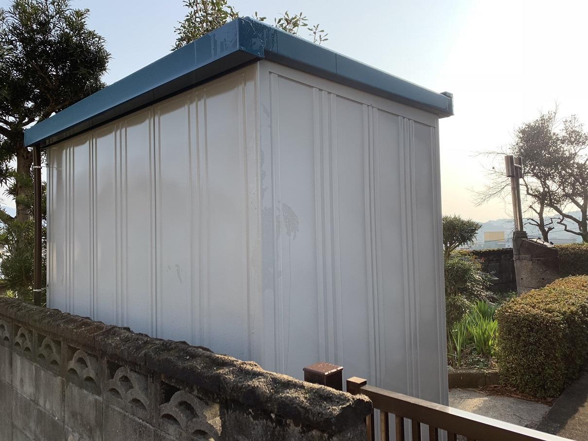 古くなって錆びかけた物置を板金工事で補強して、塗装をしました。