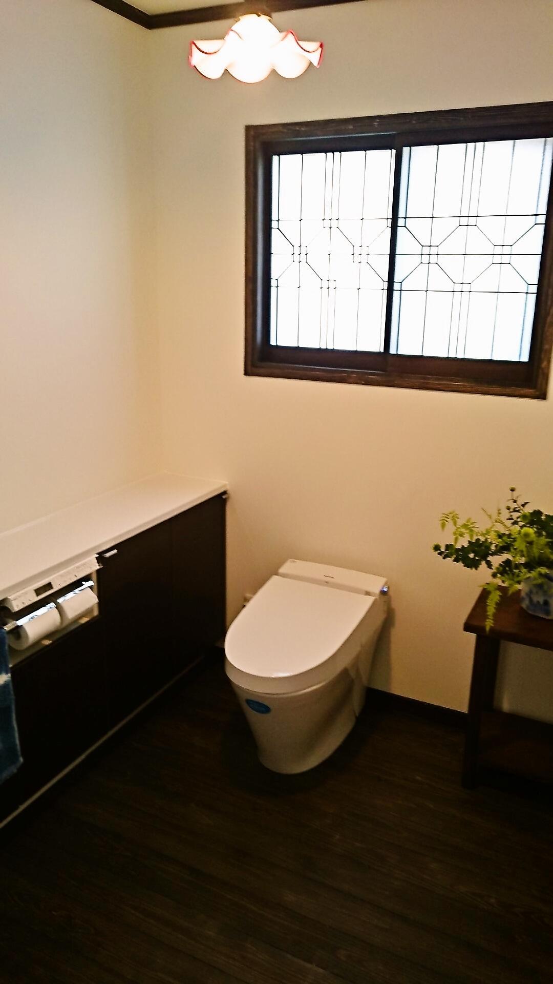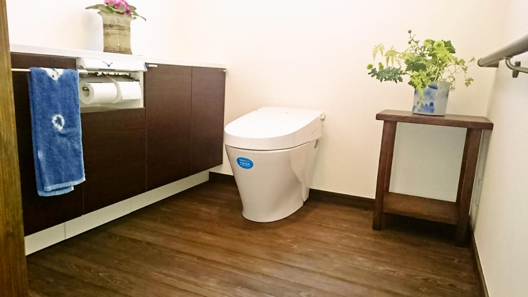 お孫様が誕生され人の出入りが多くなったことと、下水道が通ったことがきっかけでリフォームを、とお話を頂きました。奥様の抜群のセンスで落ち着きのある和風モダンなトイレが完成いたしました。今回M様が選ばれたのはタンクレストイレ「サティス」。シンプルでコンパクトなデザインなのですっきりとした明るいトイレ空間が生まれます。
