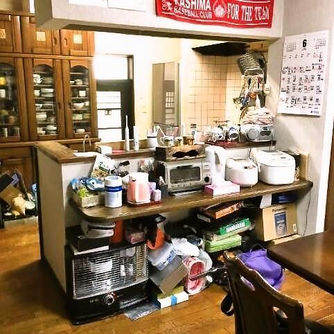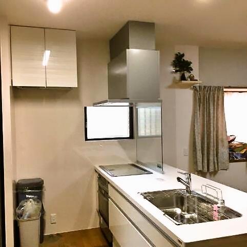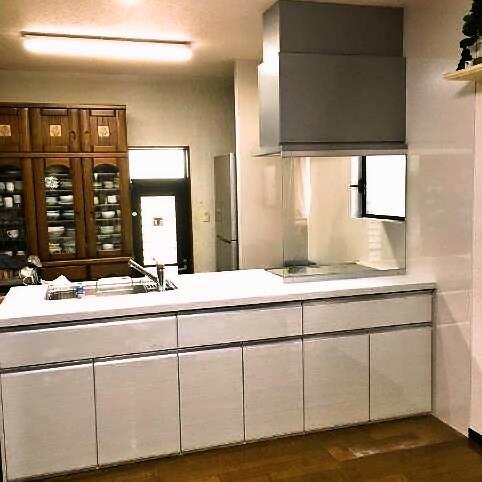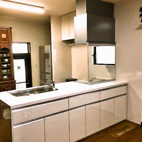 L型・吊戸棚キッチンをお使いだったお施主様ですが、今回のリフォームではI型対面(吊戸棚なし)のキッチンを選ばれました。 年数の経過したキッチンを明るくしたい!ということからフルフラットタイプのカウンターを希望された奥様。 ワークトップ・扉の色もホワイトを選ばれ、より一層、明るい空間となりました。 吊戸棚分の収納を気にされていたので、ダイニング側に収納を設けることで解消しました。