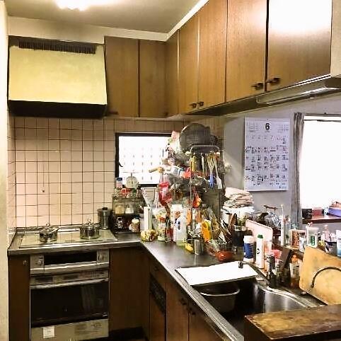 L型キッチンが古くなりところどころ壊れて使い勝手が悪くなっていたN様邸のキッチン。奥様からの要望は「明るくスッキリとしたキッチン」でした。吊戸棚を外し、オープン対面キッチンを選ばれ、ダイニング側に収納を設けました。