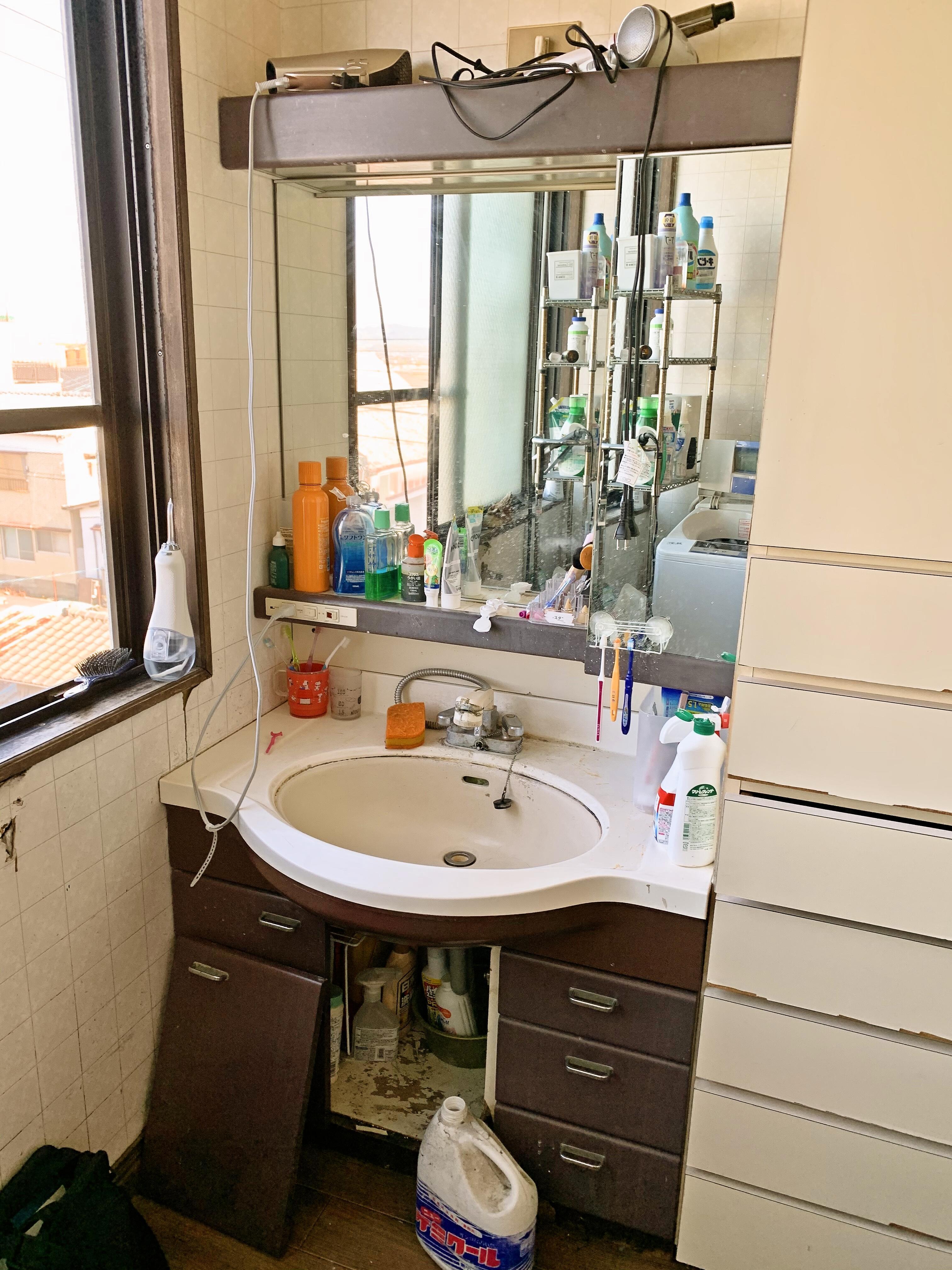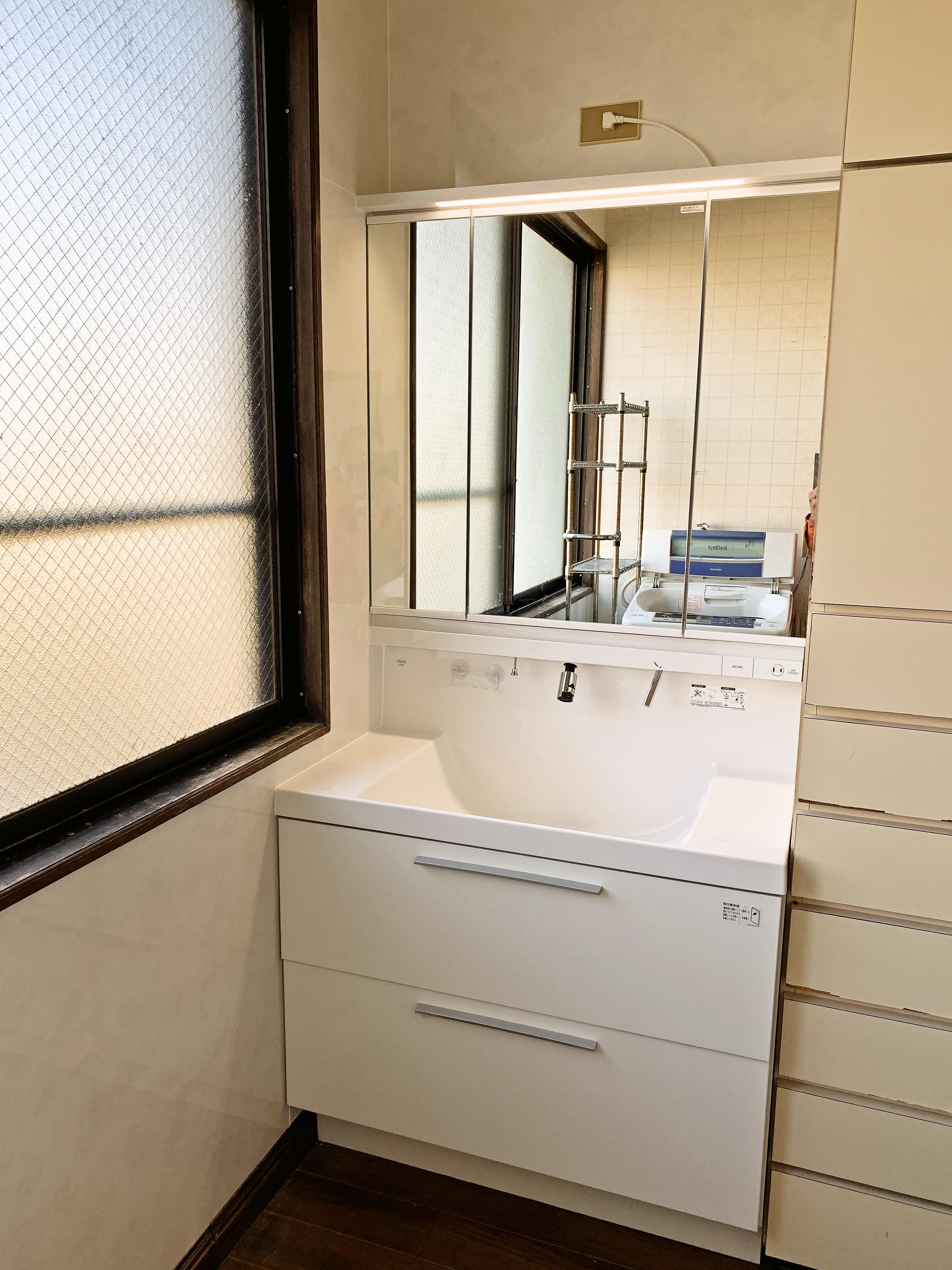 N様より、使い勝手が悪くなってきたので今まで使用している洗面化粧台と同じ間口で、収納性がある洗面化粧台を欲しいとご相談を受けました。