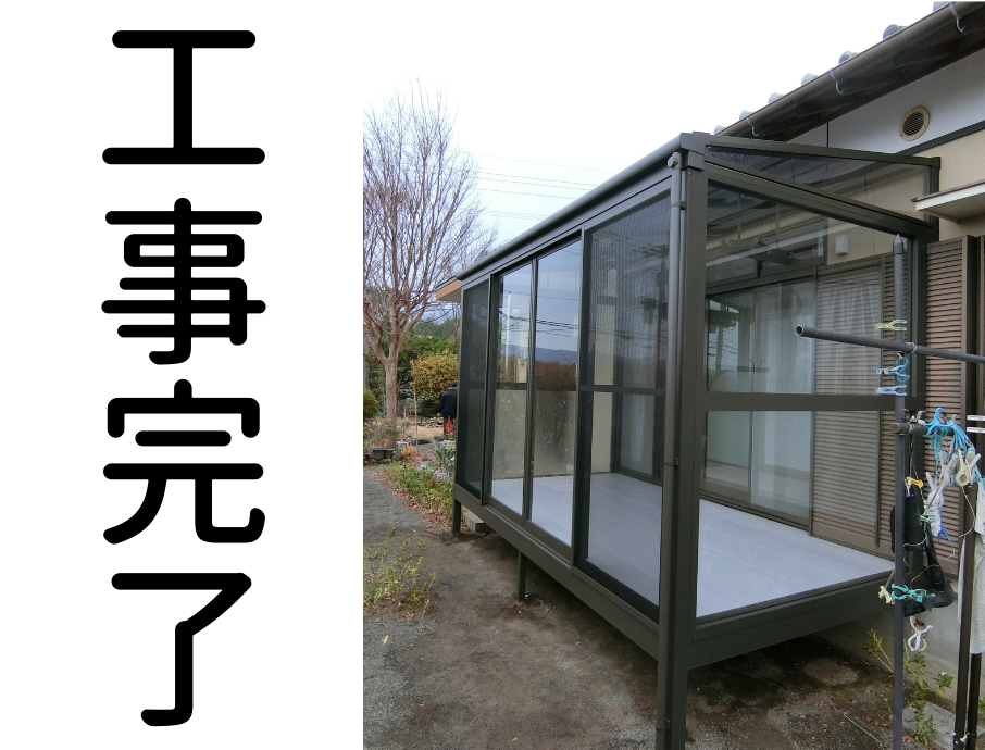 【設置後のお施主様の感想】 昼間はポカポカで最高との事。 白菜漬けを作るとサンルームの中に白菜を干されてました。 くつろぎのスペースと趣味を活かしたスペースなど 増築のように明るく暖かいスペースが増え活用の幅が広がっているようです。 建設業界に所属されておられるお施主様で、現場を確認して頂くと大変ご満足を頂けました。 プロの方にお墨付きを頂ける事は私共も大きな自信となります。