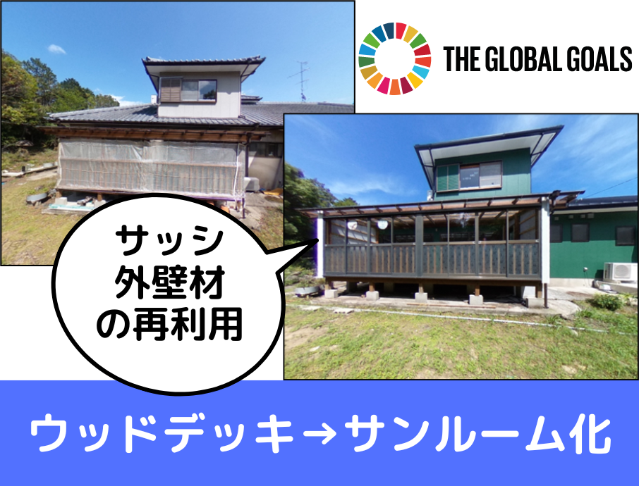 ※ウッドデッキもサンルーム的にしたかった為、撤去した多くの掃き出しサッシや余った外壁材を利用し造作も(ご主人ご要望)