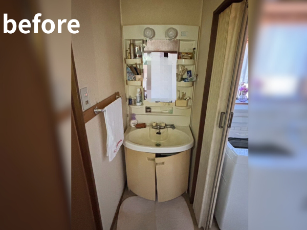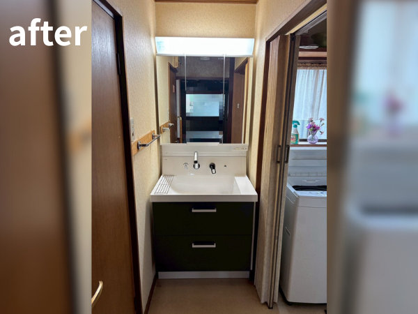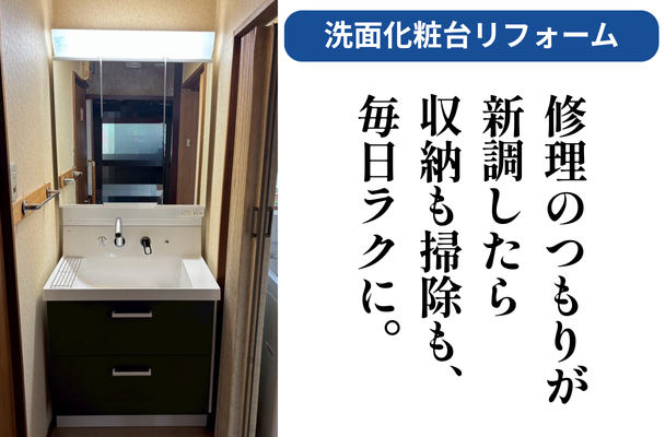 「扉の不具合から始まった、暮らしを整えるご提案」 長年大切にお使いだった洗面化粧台の収納扉が故障してしまったとのことで、当初は修理のご相談をいただきました。しかし、設置から年月が経過していたこともあり、今後他の箇所にも不具合が出る可能性や、最新設備の利便性をご説明させていただきました。