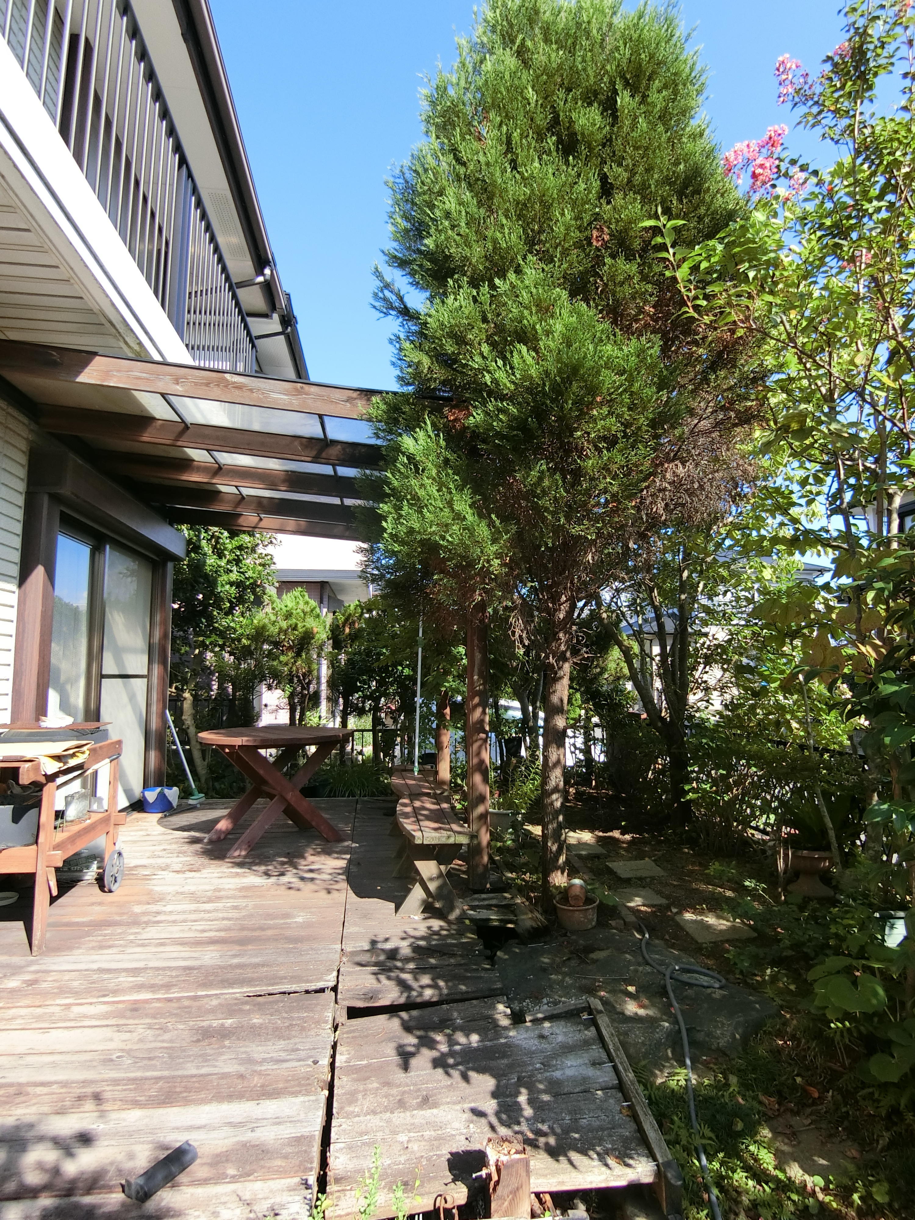 天然木ウッドデッキが経年劣化の為、腐食していたので今回取替する事になりました。工事内容は、ウッドデッキ(LIXIL樹ら楽ステージ)・テラス(YKKサザンテラス)・フェンス(YKKルシアス)・植栽及び剪定です。