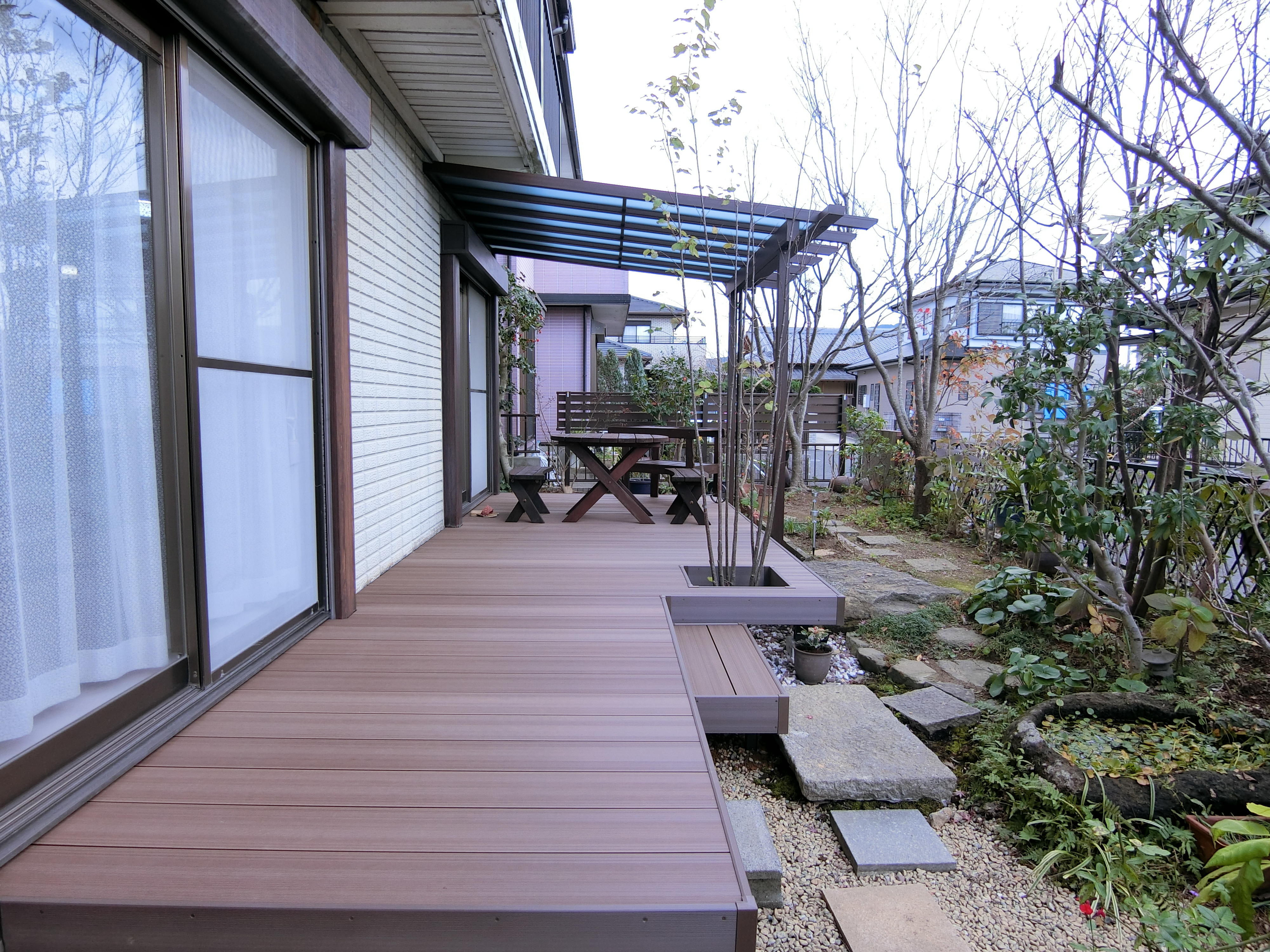 沢山打合わせをし、色々な商品を見ていただき、選定してもらいました。沢山の商品があり迷うことも多々ありましたが、工事中はお施主様に大変良くして頂きましたので、楽しくスムーズに工事をする事ができました。本当にありがとうございます。やはり、樹ら楽ステージは木目に重厚感がありいい感じです。 もう少し暖かくなったら、ご近所の方とテラスでお茶をしますと言われておりましたので、楽しい時間を作れる空間ができたらこちらも嬉しく思います♪ 色々気を使っていただきありがとうございました。