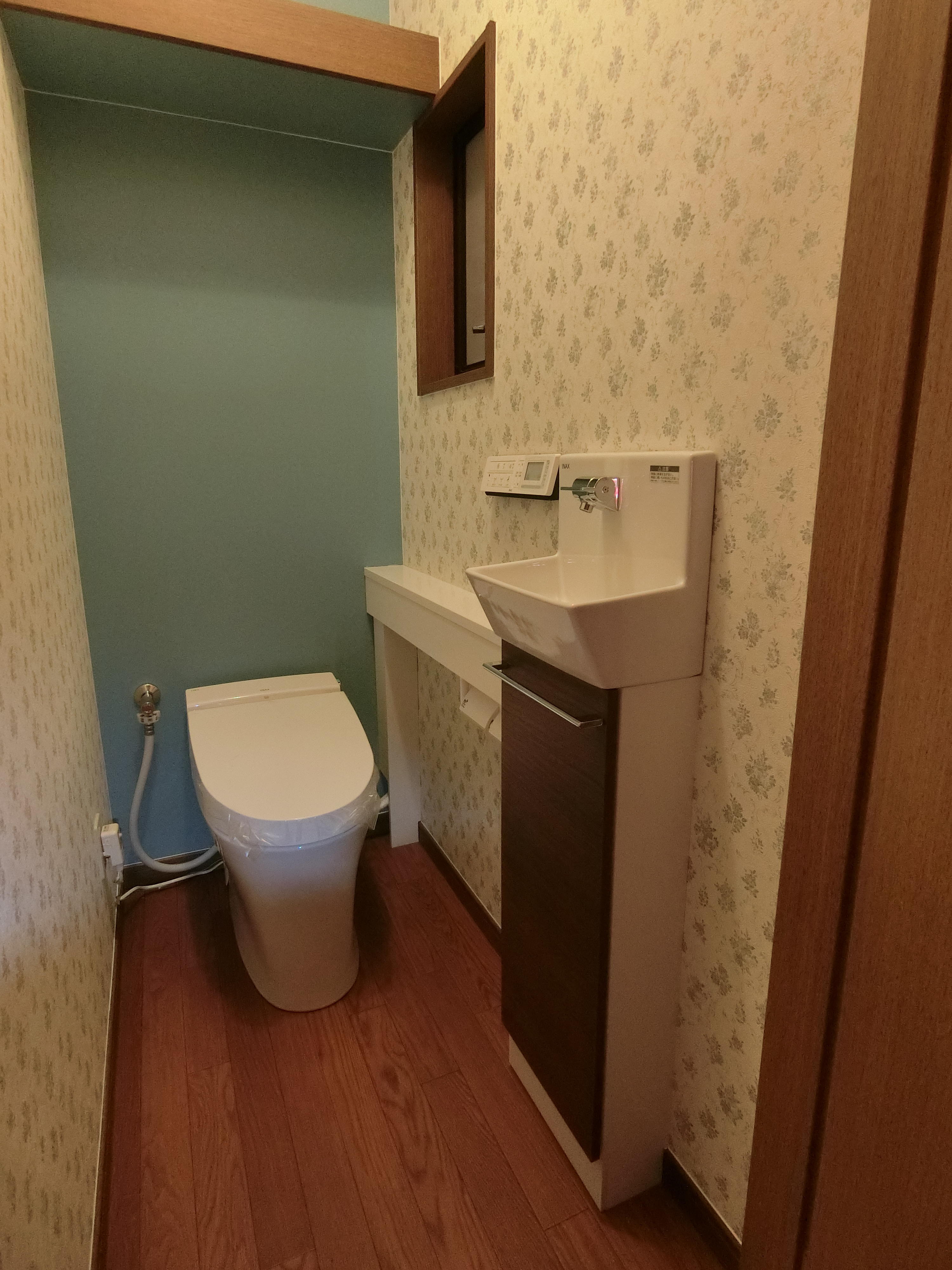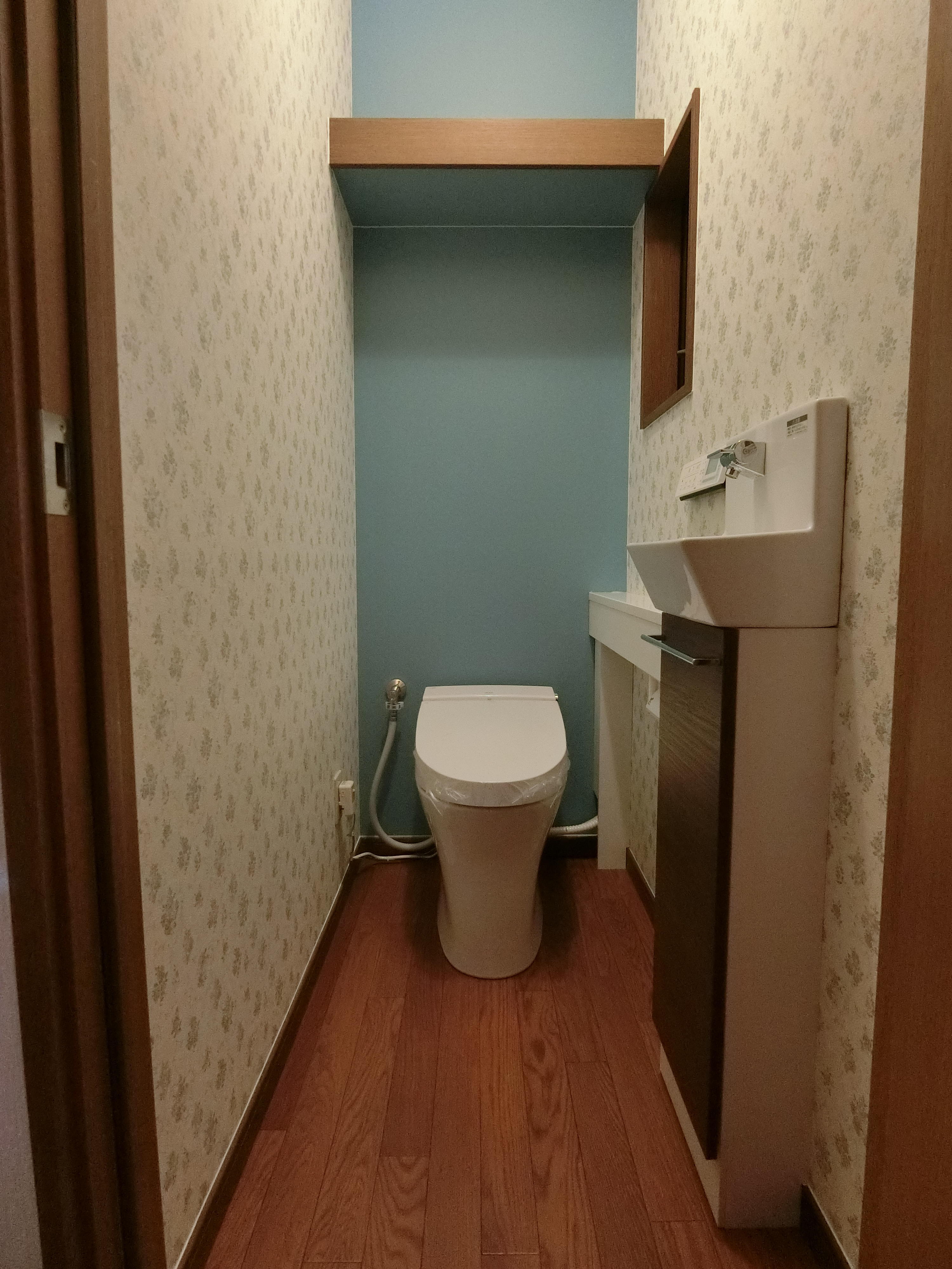劇的に変身したトイレ空間になり、嬉しく思います♪お施主様がブルー色が好きだと言うことでクロス選びも楽しくさせて頂きました。アクセントクロスの色がとても綺麗です(^^) 施工時間がかかり、お施主様にはご迷惑をお掛けしましたが、リフォームしたトイレ空間を気に入っていただけたら嬉しく思います(^^)ありがとうございました。