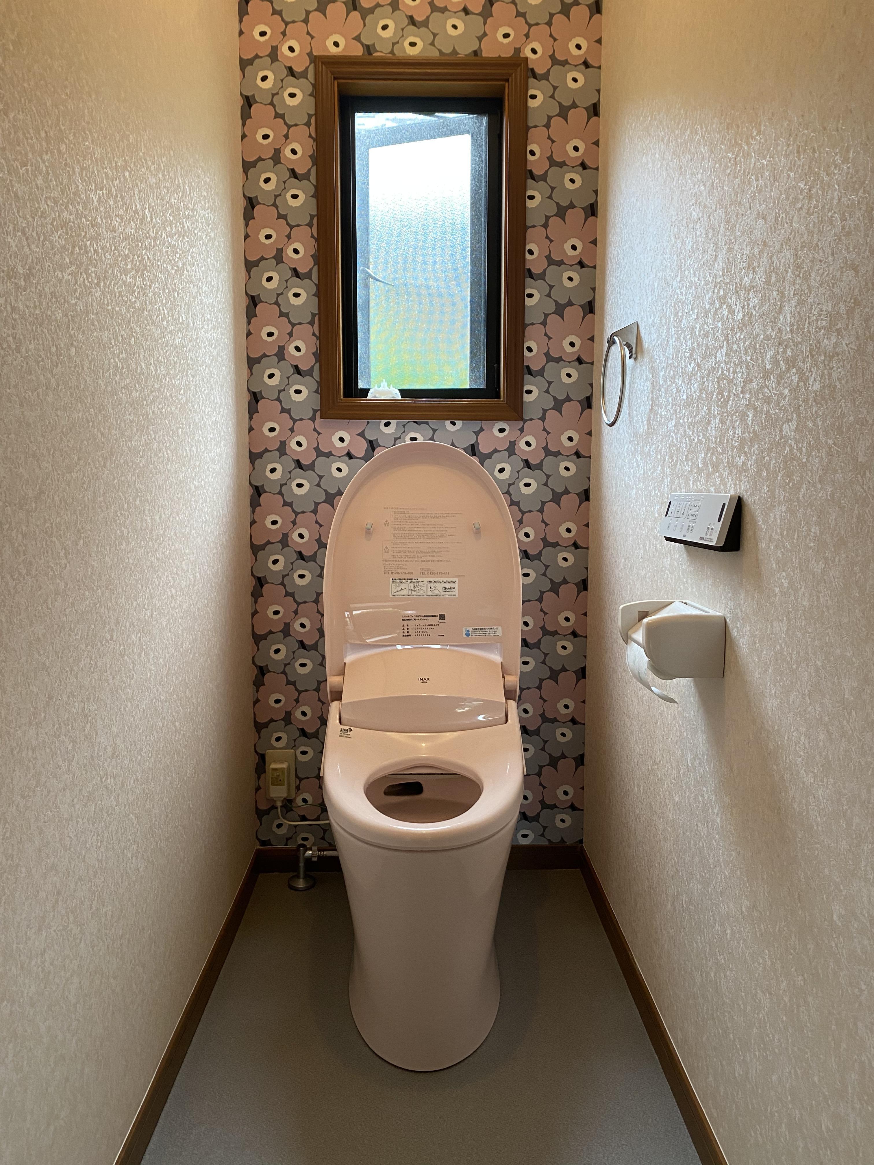 キュートな花柄のアクセントクロスでおしゃれな雰囲気に仕上がりました。 また、床も似た色味のクッションフロアへ張り替えたことで統一感のある洗練されたトイレ空間となりました。